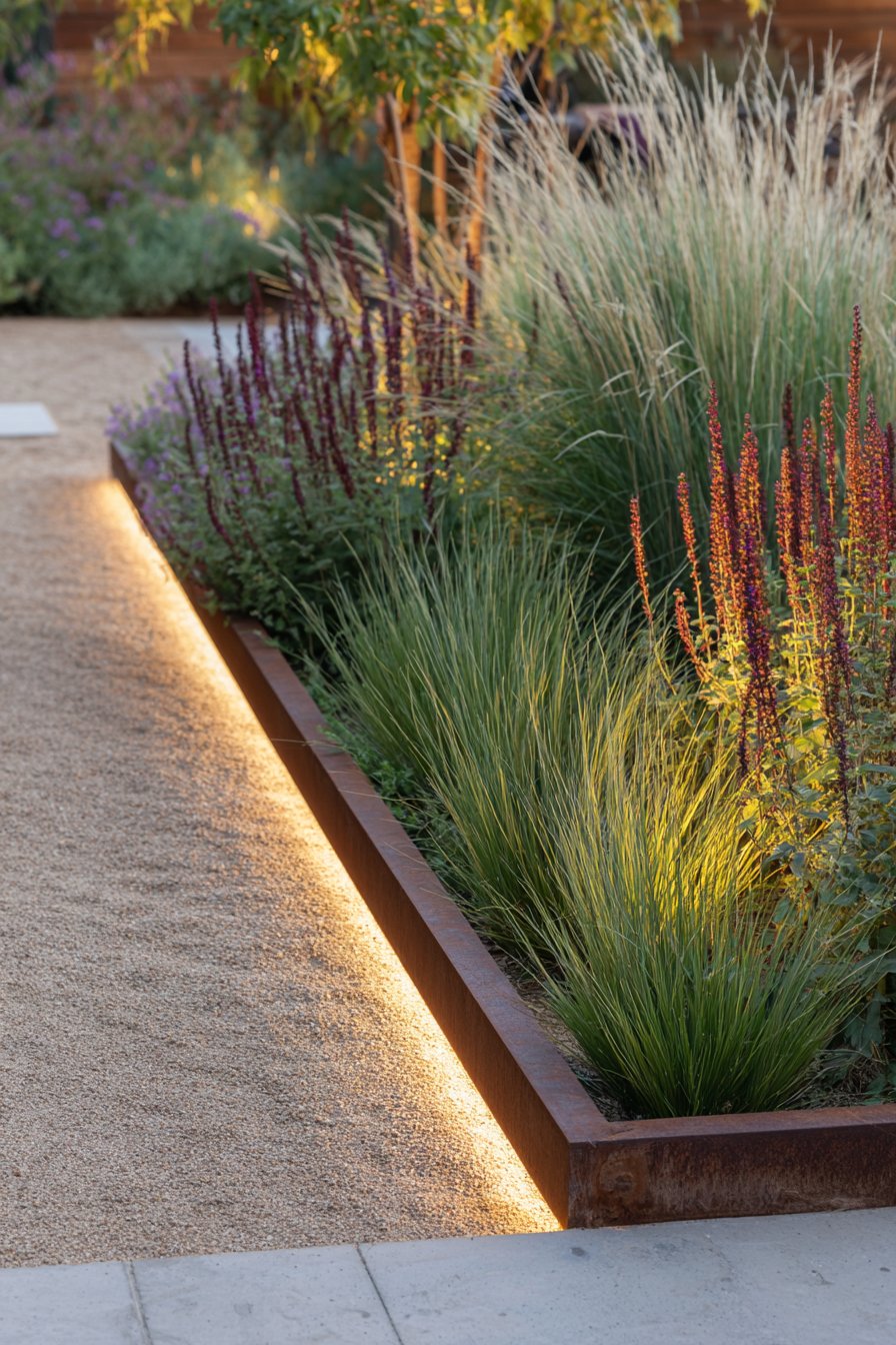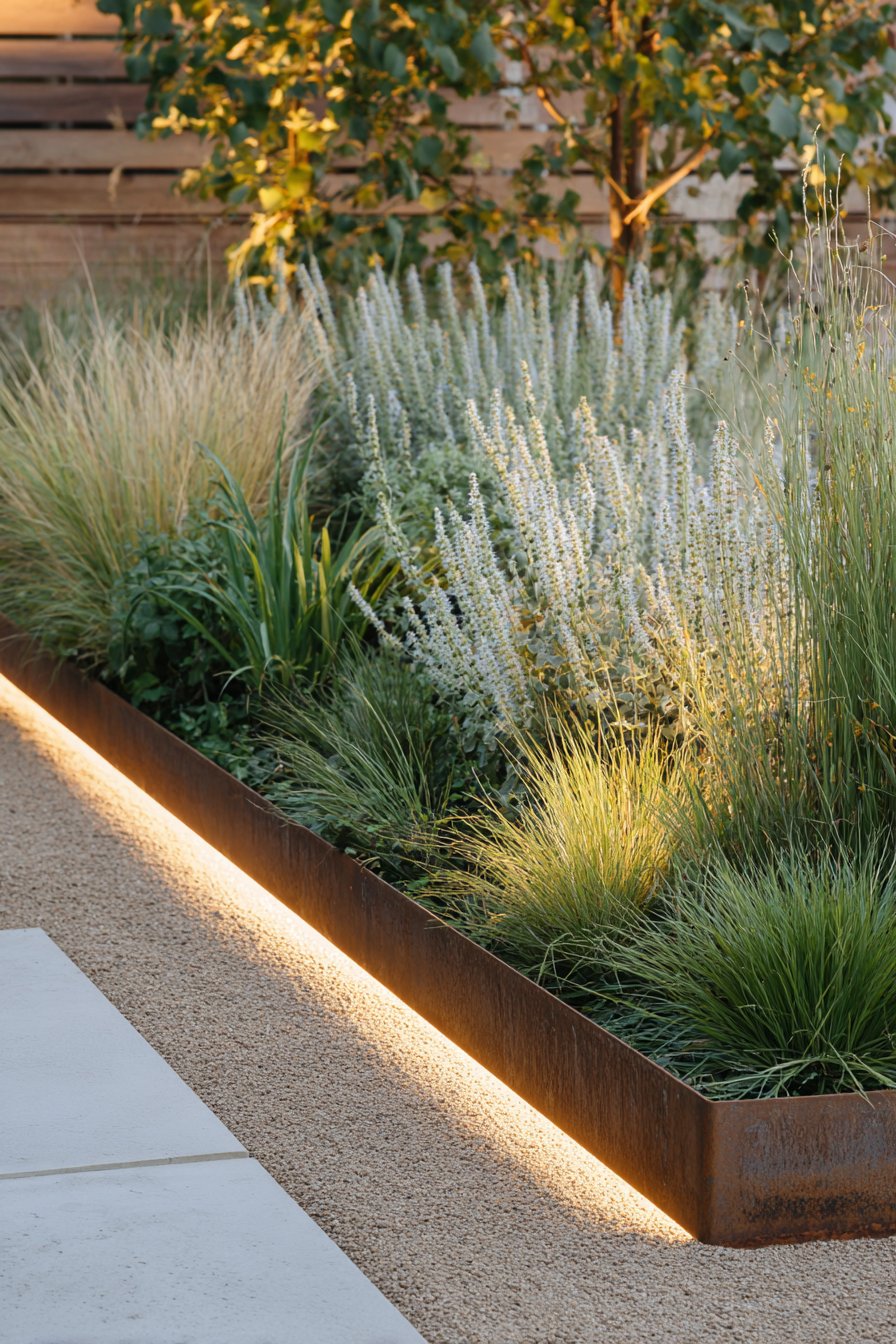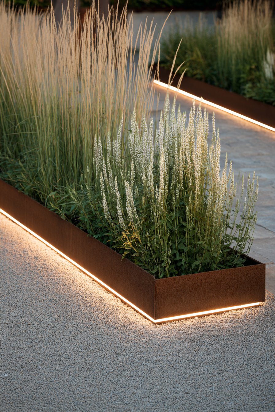 The sleek LED garden edge lighting beautifully highlights the lush textures and colors of the vibrant planting, creating a striking contrast against the rustic metal borders. For a similar effect, consider using low-maintenance perennials and strategically placed lighting to enhance your garden’s natural beauty at night.