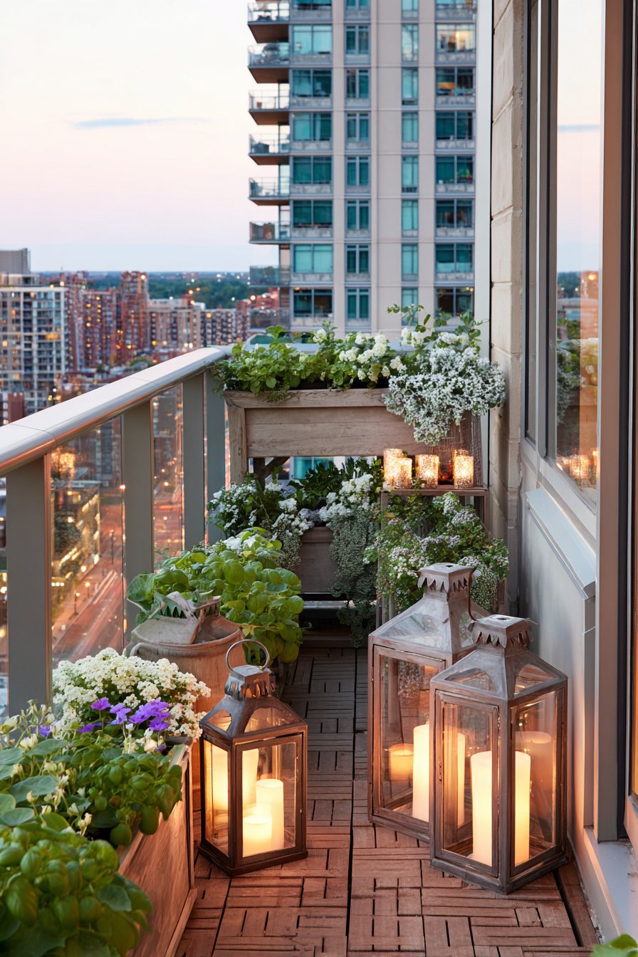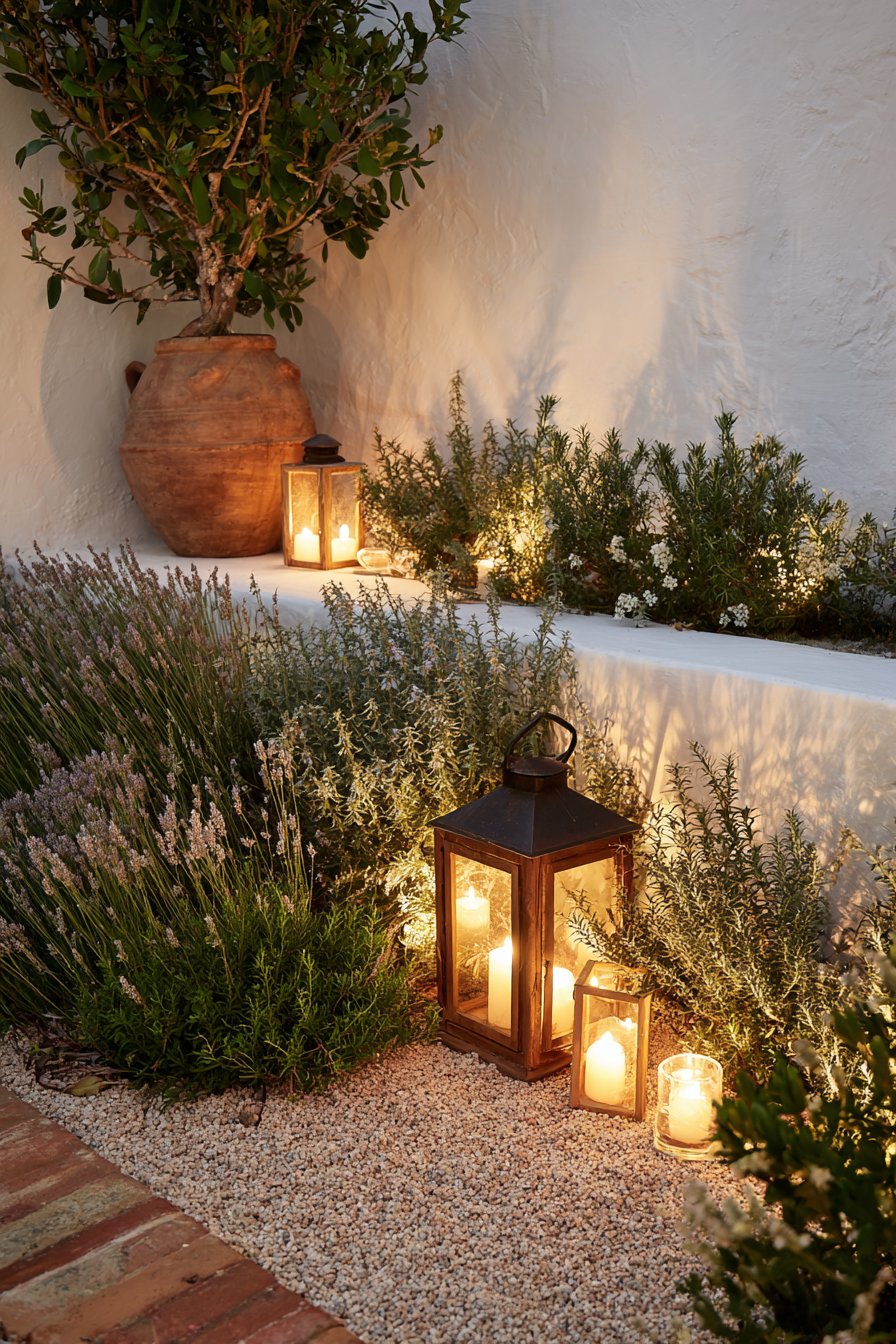 Warm lanterns and soft candlelight create an inviting atmosphere, beautifully highlighting lush greenery and fragrant lavender amidst a serene . To achieve this look, incorporate rustic lanterns and a mix of low-maintenance plants for texture and warmth.