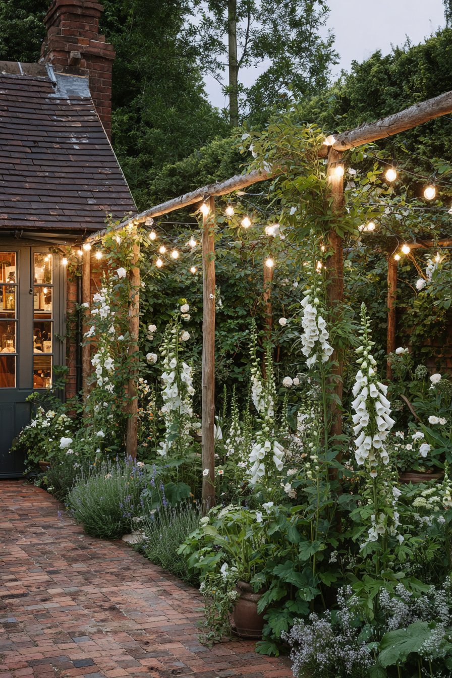 Warm string lights delicately drape over a lush display of white roses and vibrant foxgloves, creating an enchanting evening atmosphere. To replicate this charm, combine soft lighting with a mix of flowering plants in varied heights for depth and interest.