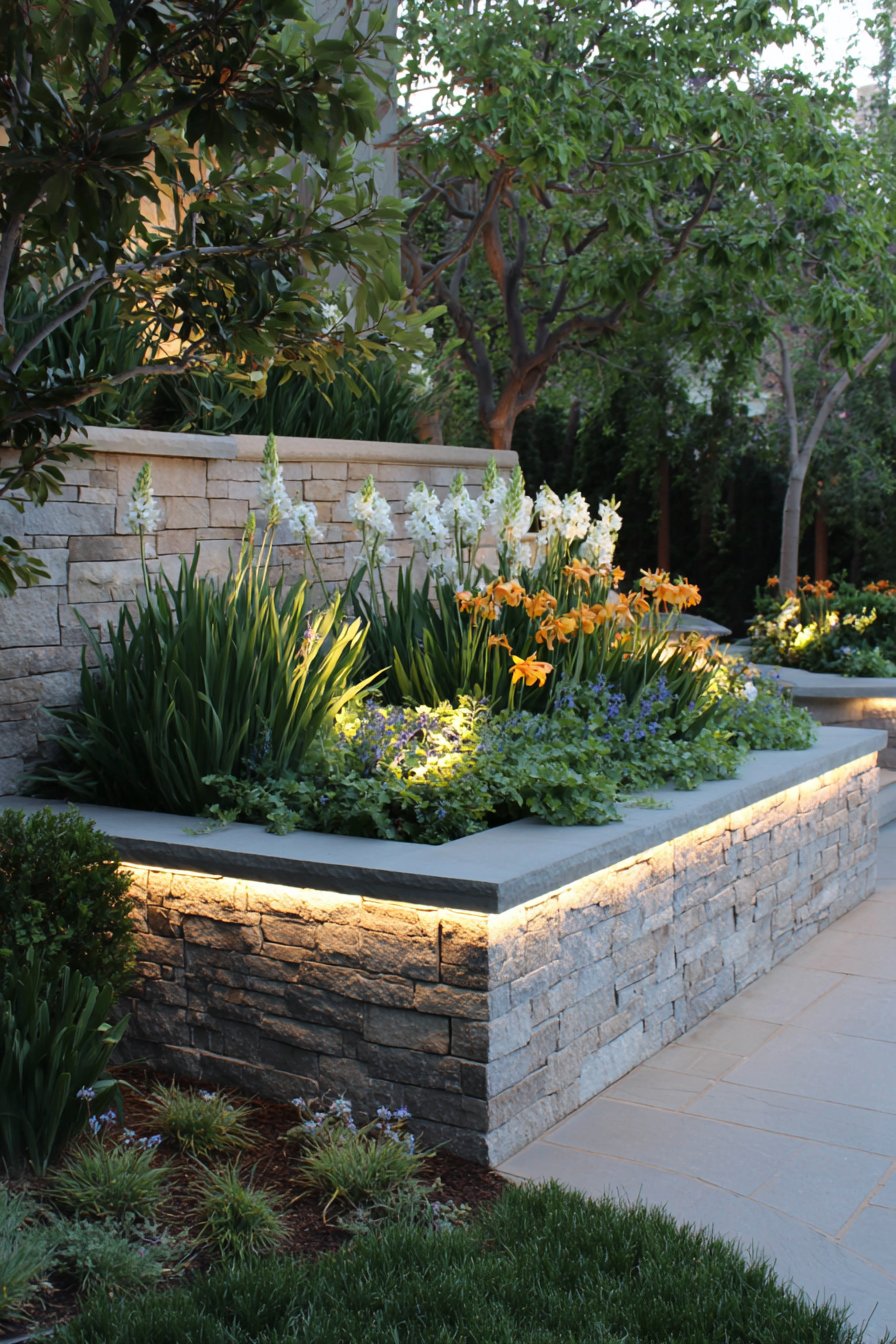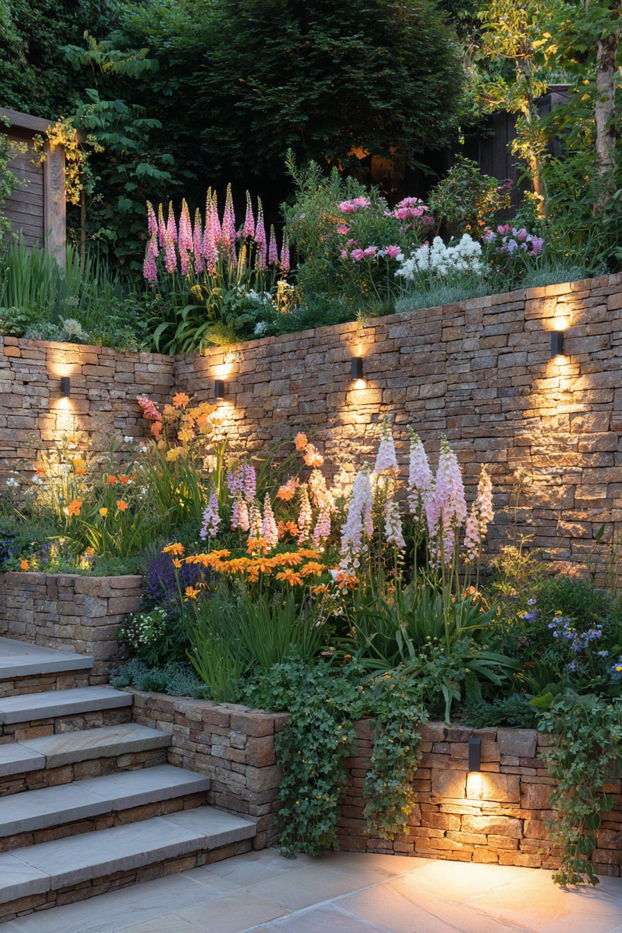 Warm wall sconces beautifully illuminate vibrant blooms, enhancing the textured stone walls and creating a cozy, inviting atmosphere. To replicate this look, choose layered planting with a mix of heights and colors, and incorporate strategic lighting to highlight key features.
