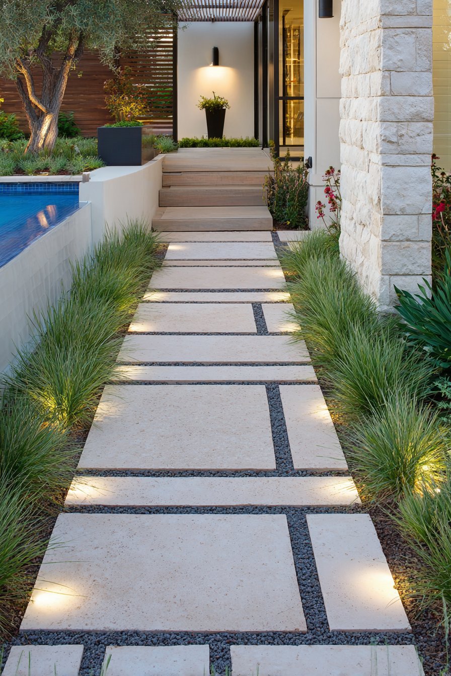 Soft, warm lighting highlights the clean lines of the stone pathway, creating a serene ambiance that invites exploration. Incorporate low-maintenance grasses and carefully placed accent lights to enhance the visual appeal while ensuring safety and accessibility.