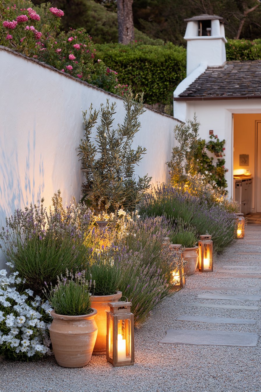 Warm lanterns cast a soft glow on vibrant lavender and white blooms, creating an enchanting pathway that invites evening strolls. To replicate this look, combine fragrant plants like lavender with rustic lighting for a cozy atmosphere.