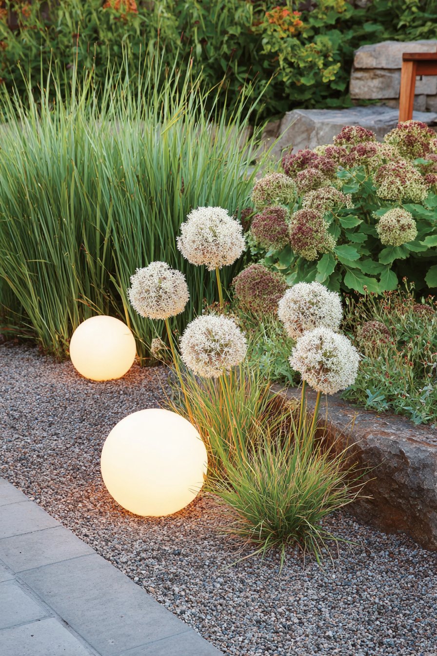 The soft glow of garden orbs beautifully highlights the textured foliage and blooms, creating an inviting and serene atmosphere. To achieve this look, use spherical lights paired with varied plant heights, such as ornamental grasses and alliums, for dynamic visual interest.
