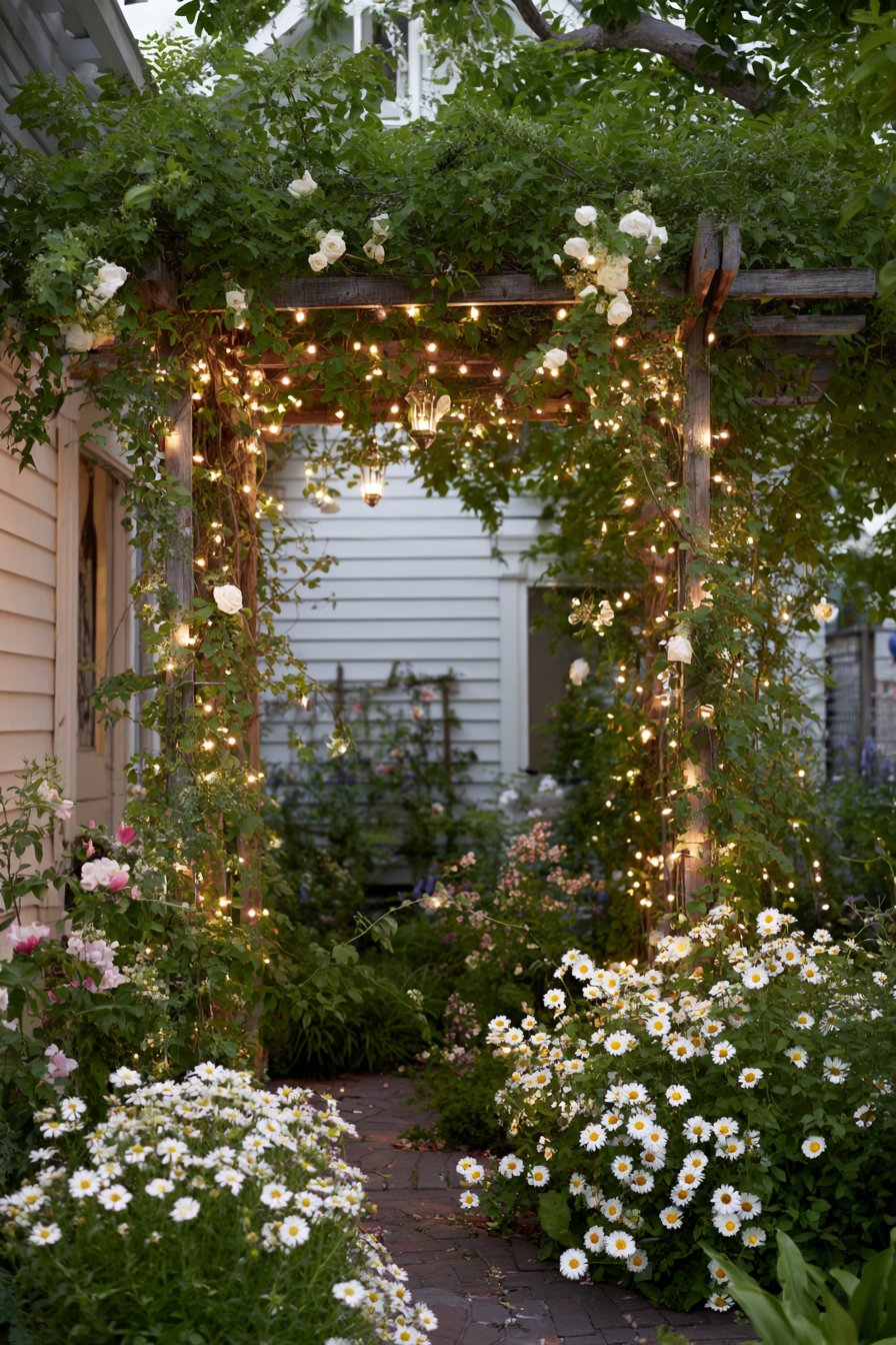 Twinkling string lights drape elegantly over a rustic arbor, creating a magical ambiance that enhances the lush greenery and vibrant blooms below. To replicate this enchanting look, combine climbing plants with warm lighting and a mix of perennials for year-round texture and color.