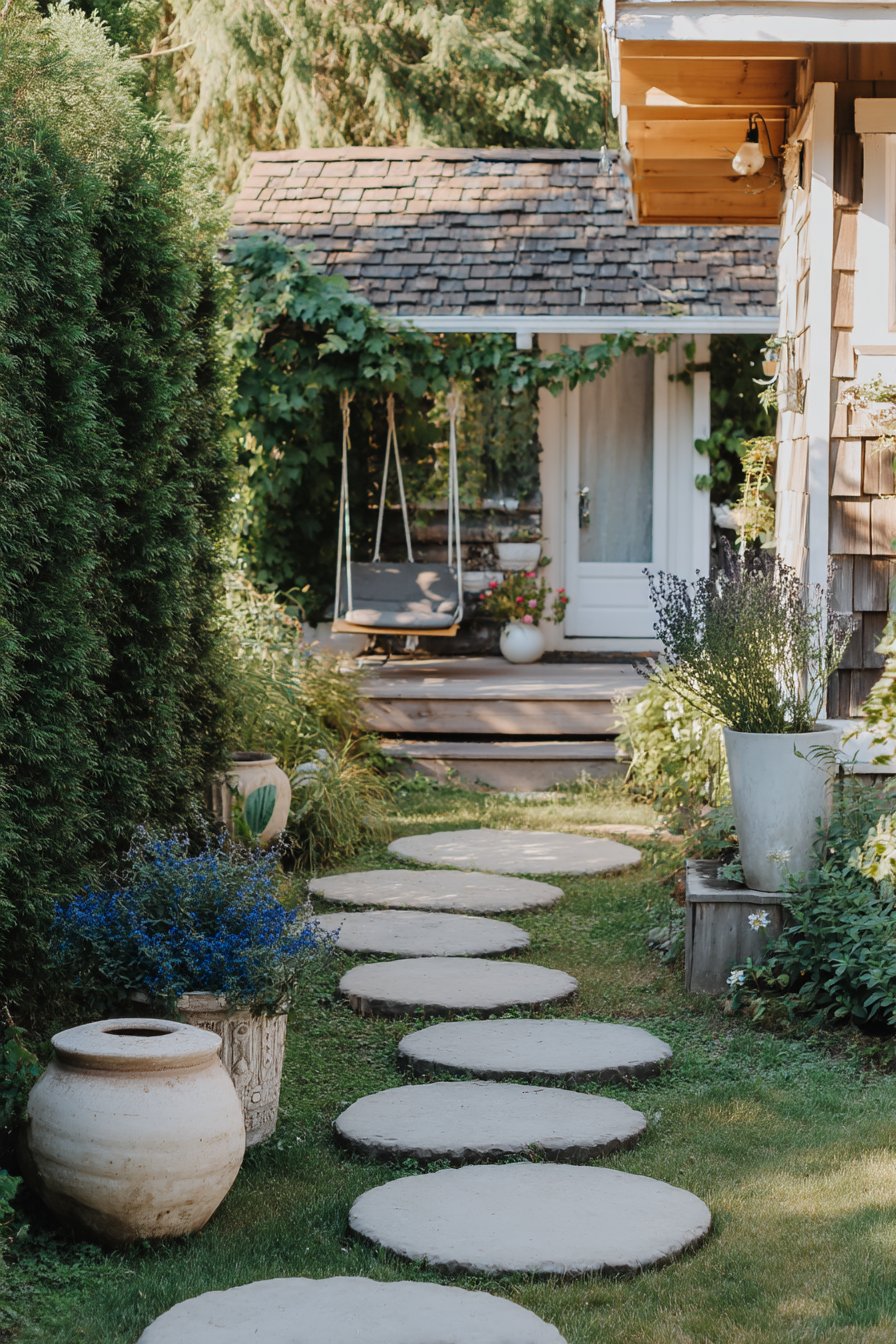 The charming round stepping stones create a whimsical pathway, beautifully complemented by lush greenery and vibrant like brunnera. To achieve this serene look, incorporate a mix of perennials and decorative containers for added texture and color.
