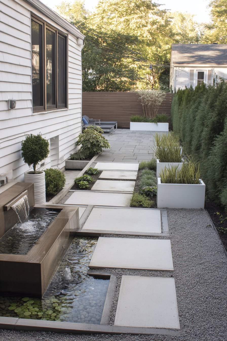 This garden design beautifully combines sleek stone pathways with a tranquil water feature, creating a serene atmosphere perfect for relaxation. To replicate this look, consider using low-maintenance plants like boxwoods and ornamental grasses alongside modern planters for a contemporary touch.