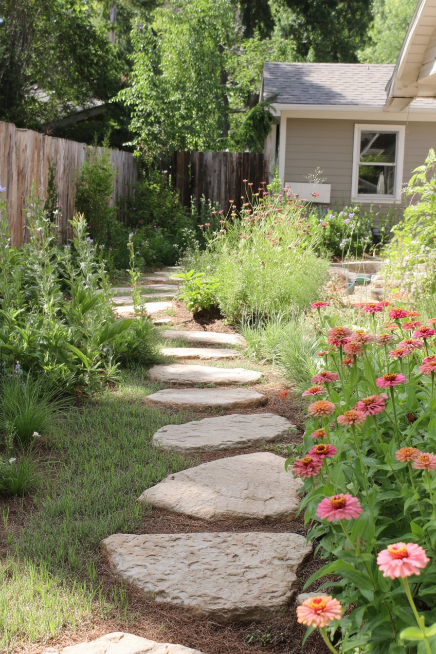 A charming rustic pathway, lined with vibrant zinnias, invites exploration while adding a splash of color to the garden. To achieve this look, combine natural stone stepping stones with a mix of perennials and annuals for a lively, textured effect.