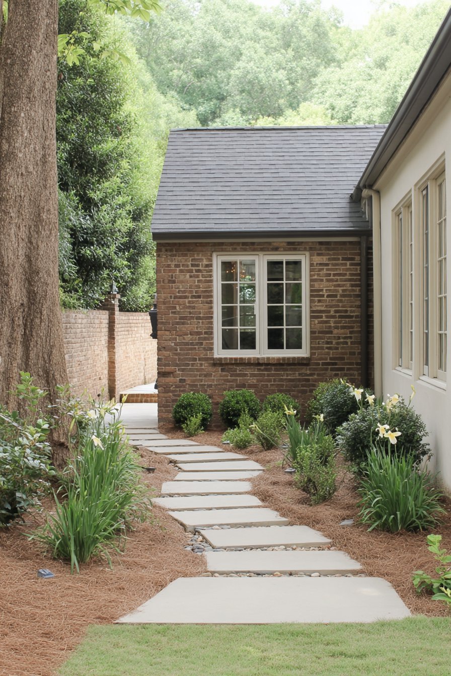 The charming combination of rustic stone pathways and lush greenery creates a warm, inviting atmosphere, perfect for leisurely strolls. Incorporate low-maintenance plants like boxwoods and ornamental grasses to achieve this serene look in your own garden.
