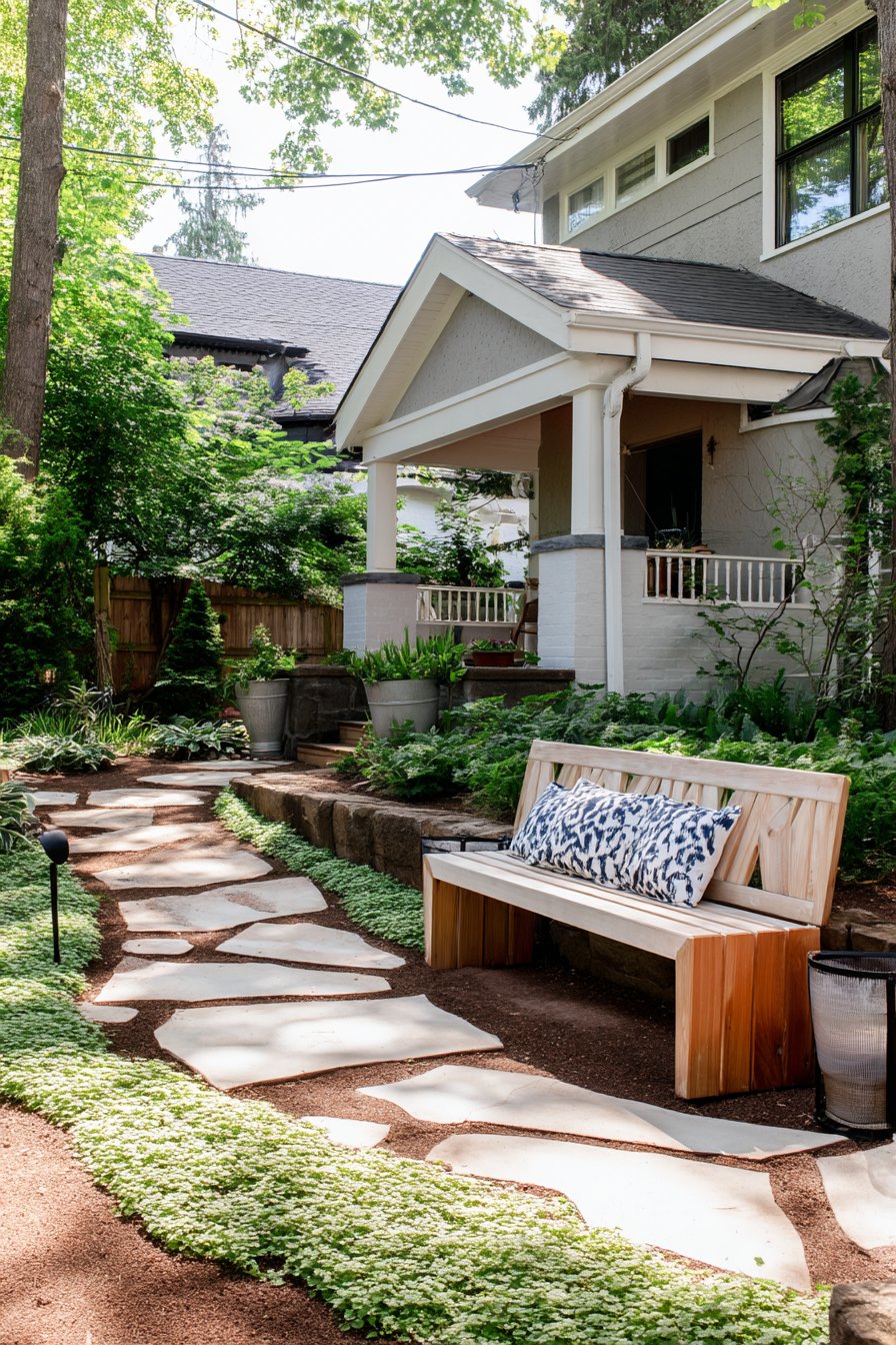 A charming natural stone pathway meanders through lush greenery, featuring aromatic herbs like lavender and thyme that add texture and fragrance. Incorporate a simple wooden bench for a cozy seating area, inviting relaxation amidst the beauty of your garden.