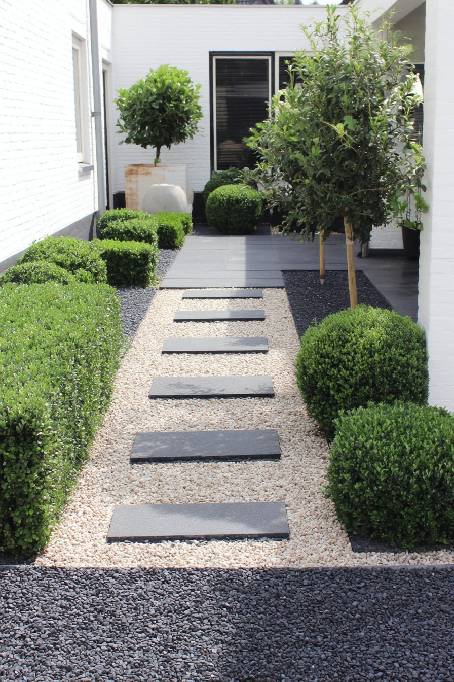 The sleek contrast of dark stepping stones against a bed of light gravel creates a stunning visual pathway, framed beautifully by lush boxwood hedges. For a similar effect, consider using varied textures and colors in your hardscaping while incorporating low-maintenance plants like boxwood for structure.