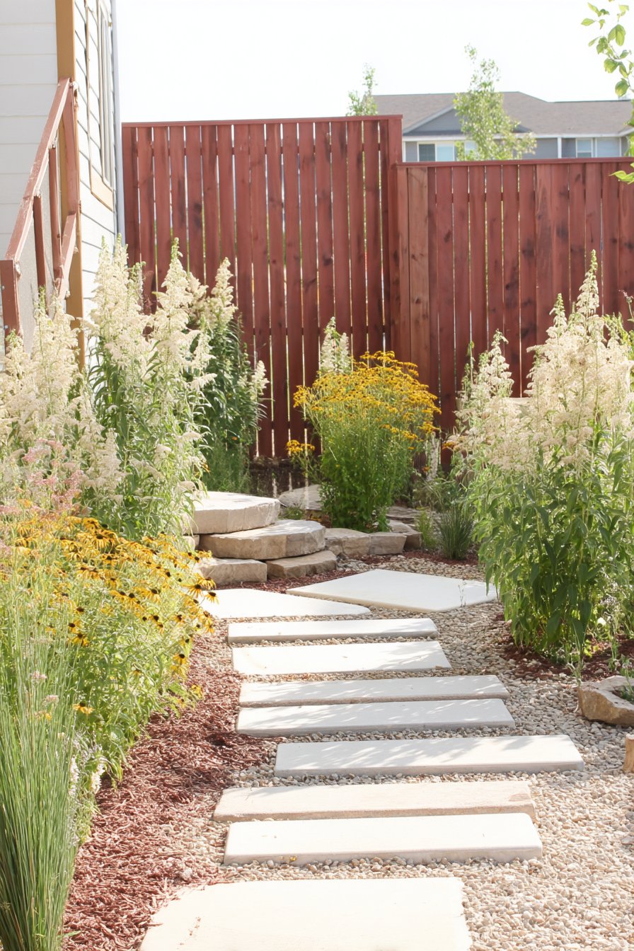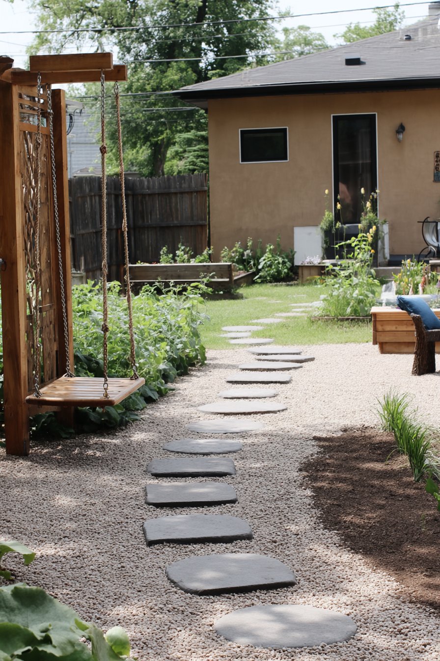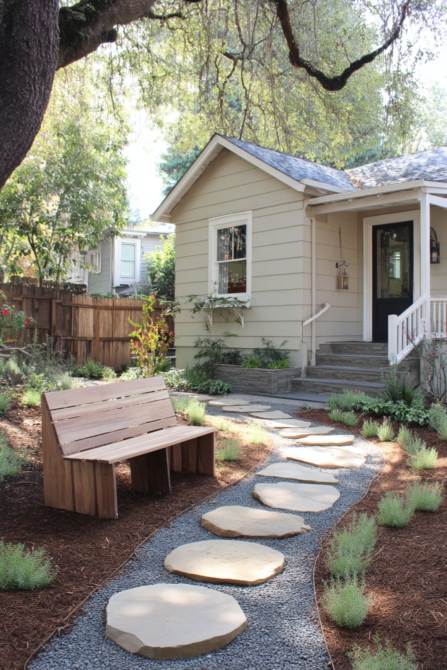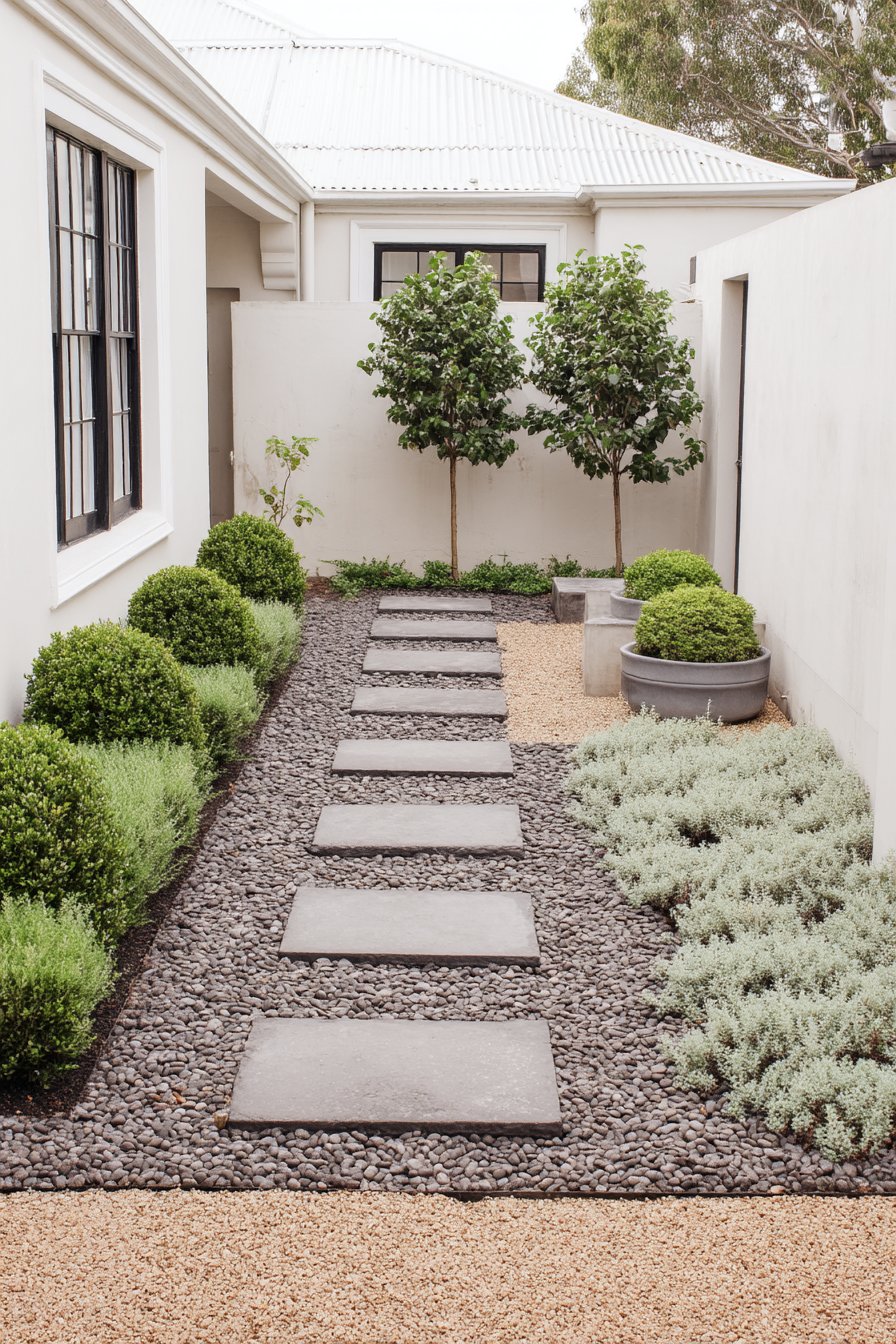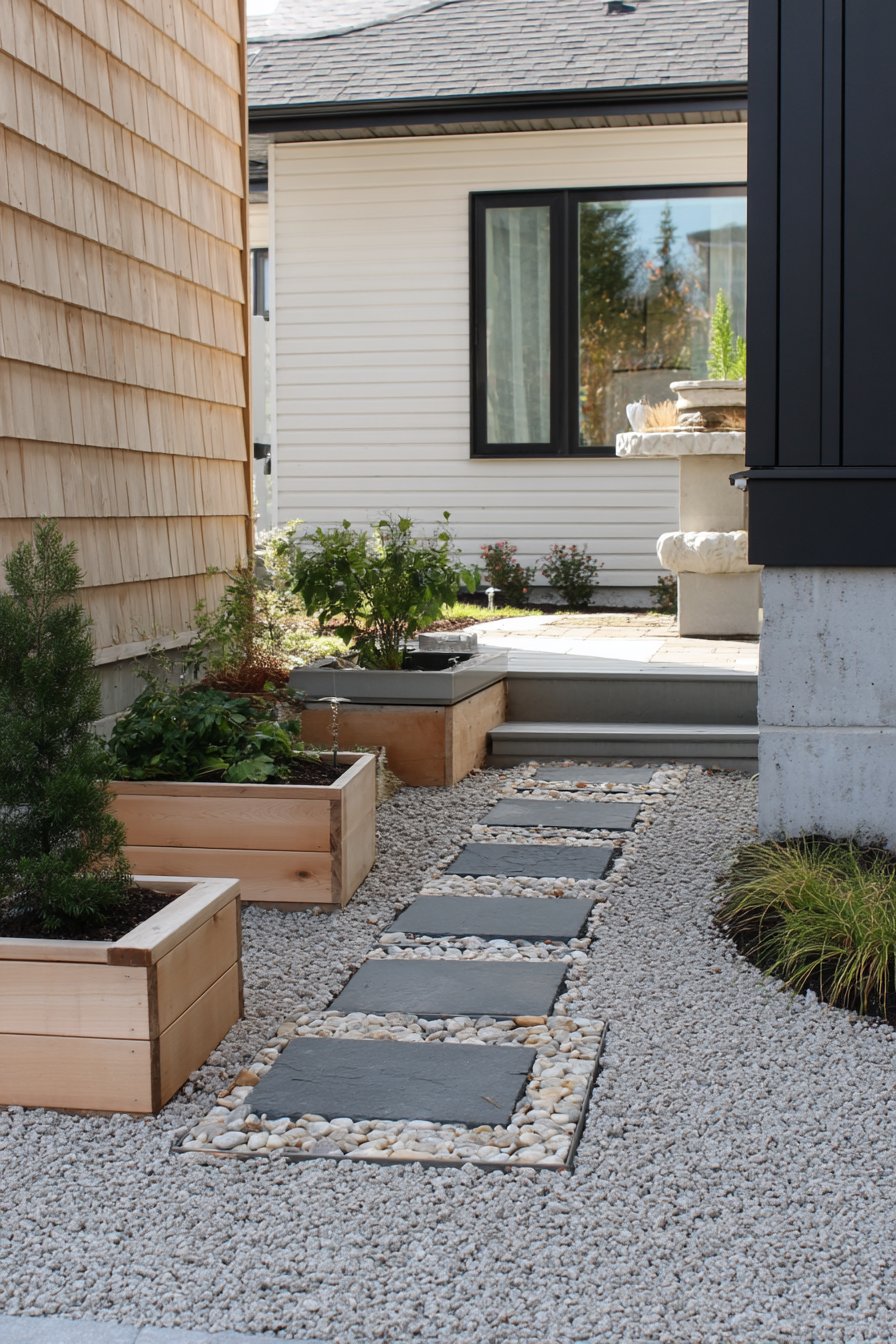 The sleek slate stepping stones, bordered by smooth pebbles, create a modern and inviting pathway that harmonizes beautifully with lush greenery. For a similar aesthetic, incorporate raised wooden planters filled with hardy plants like lavender or ornamental grasses for texture and color contrast.
