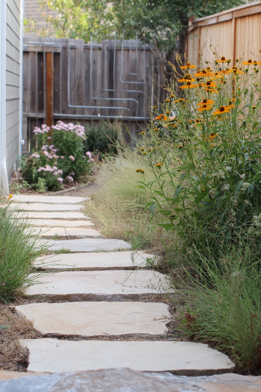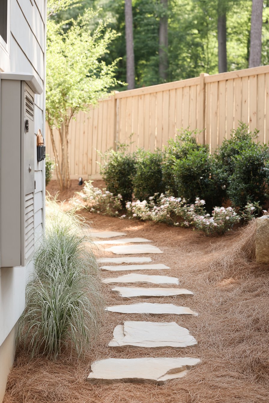 The natural stone pathway elegantly meanders through lush greenery, with vibrant and fragrant herbs adding texture and color. To replicate this look, incorporate and a mix of stones for a harmonious, low-maintenance design.