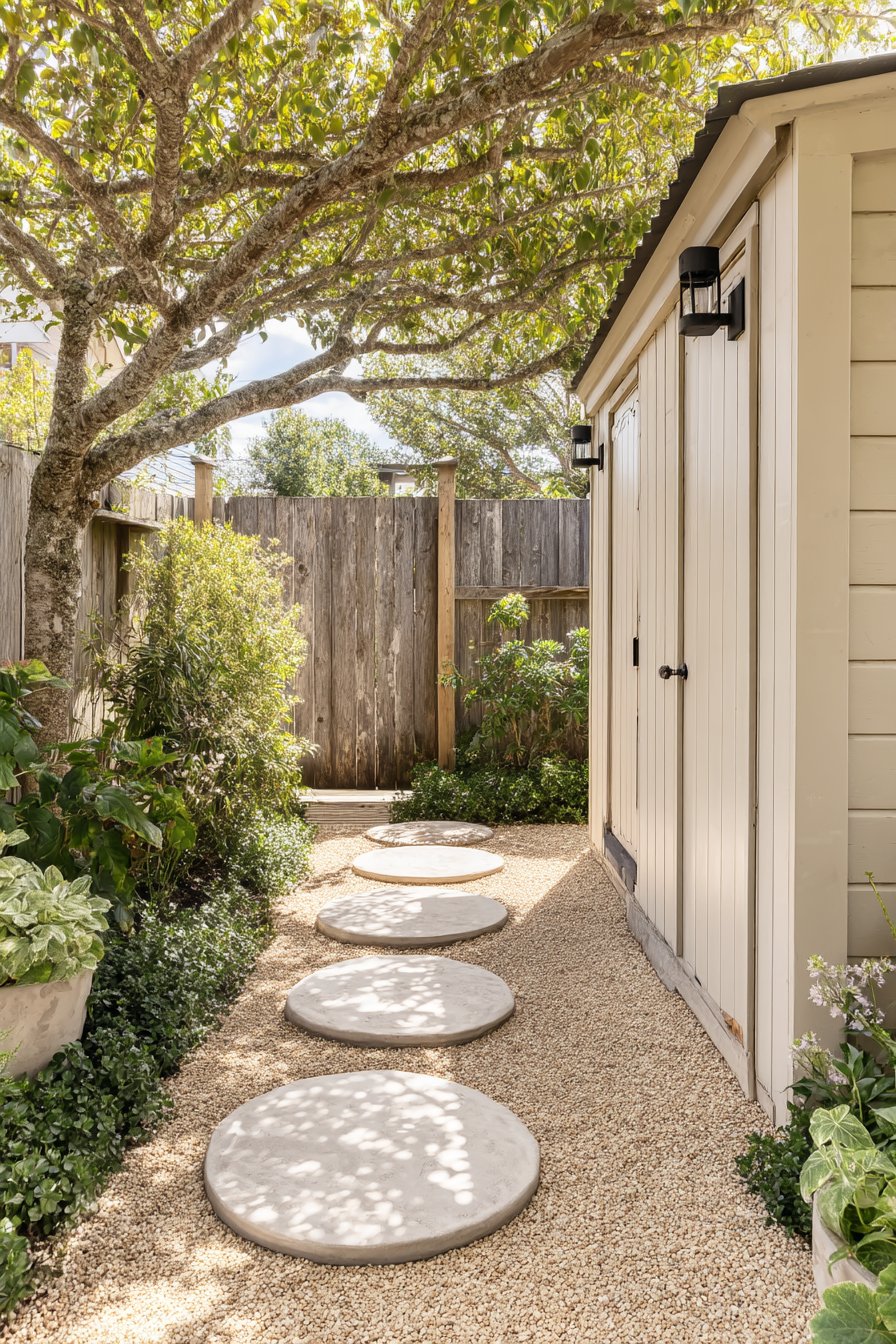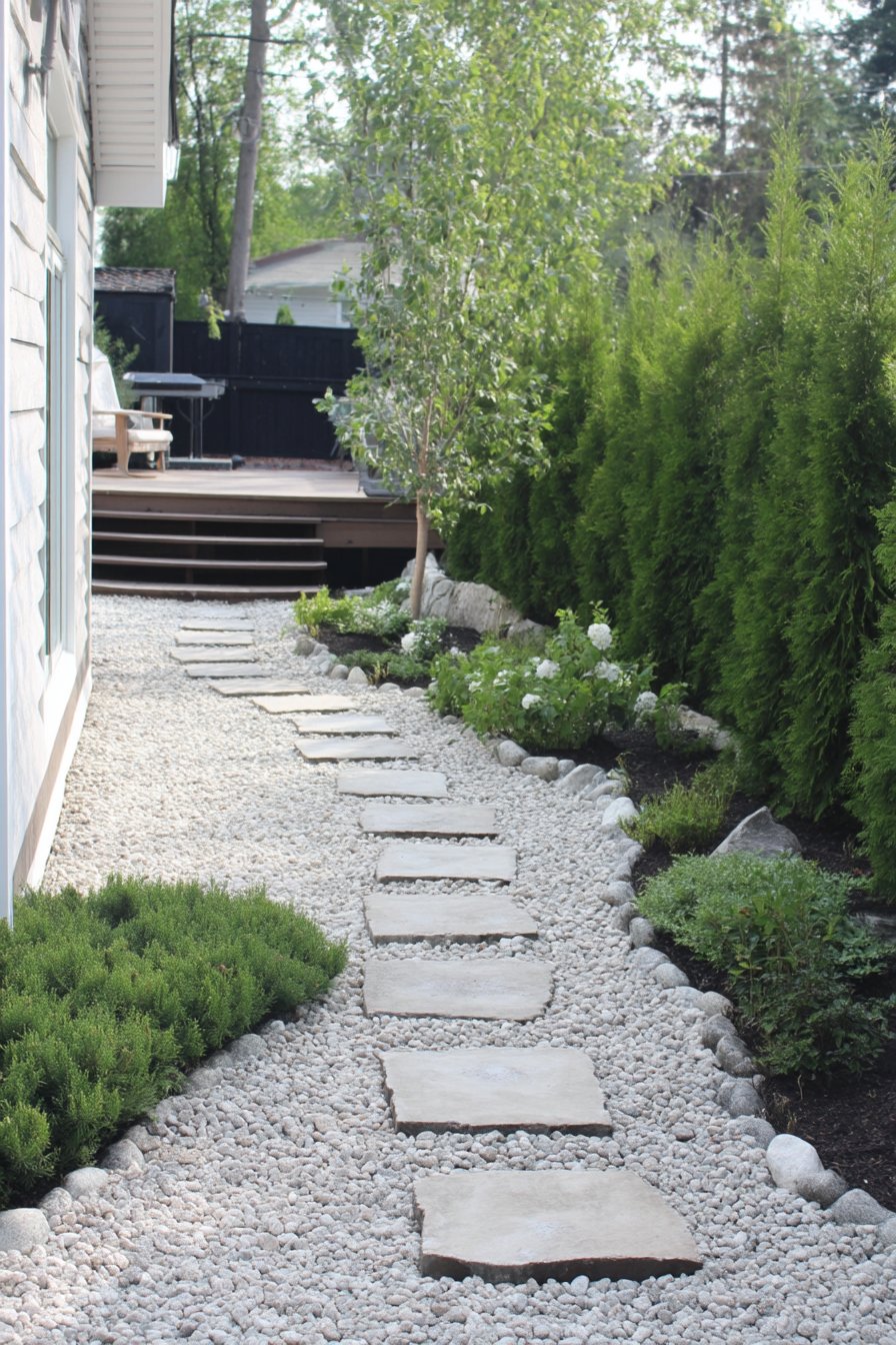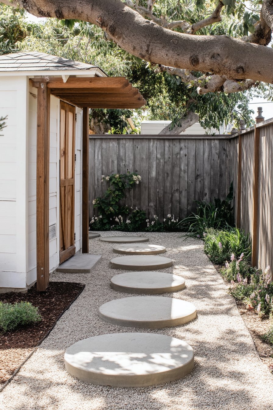 The contemporary gravel path, accented with smooth stepping stones, invites a sense of tranquility and simplicity, perfect for any garden space. Incorporate low-maintenance plants like succulents and decorative grasses alongside the path for a striking yet effortless aesthetic.