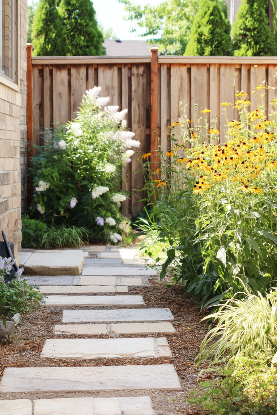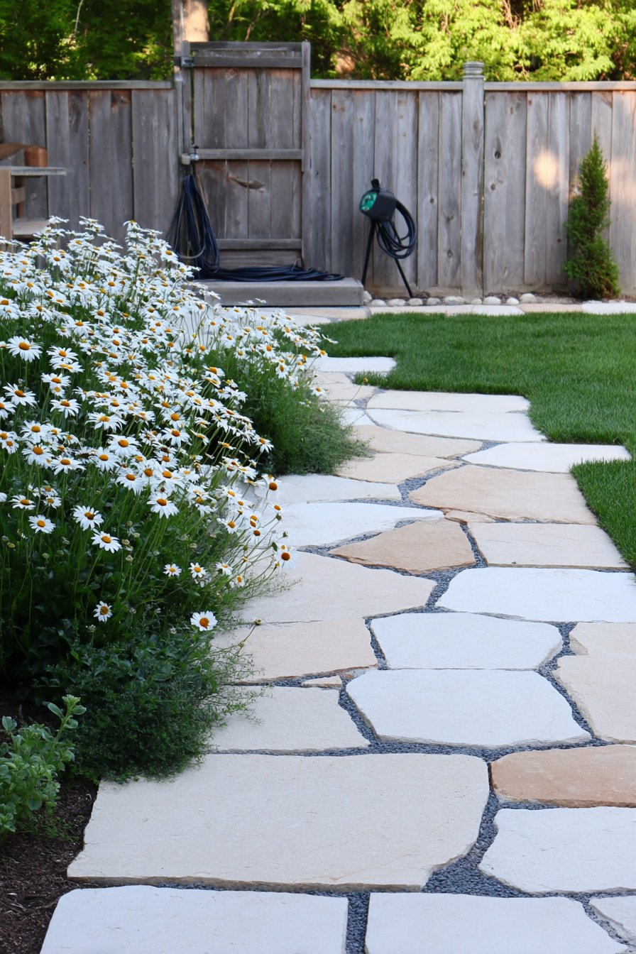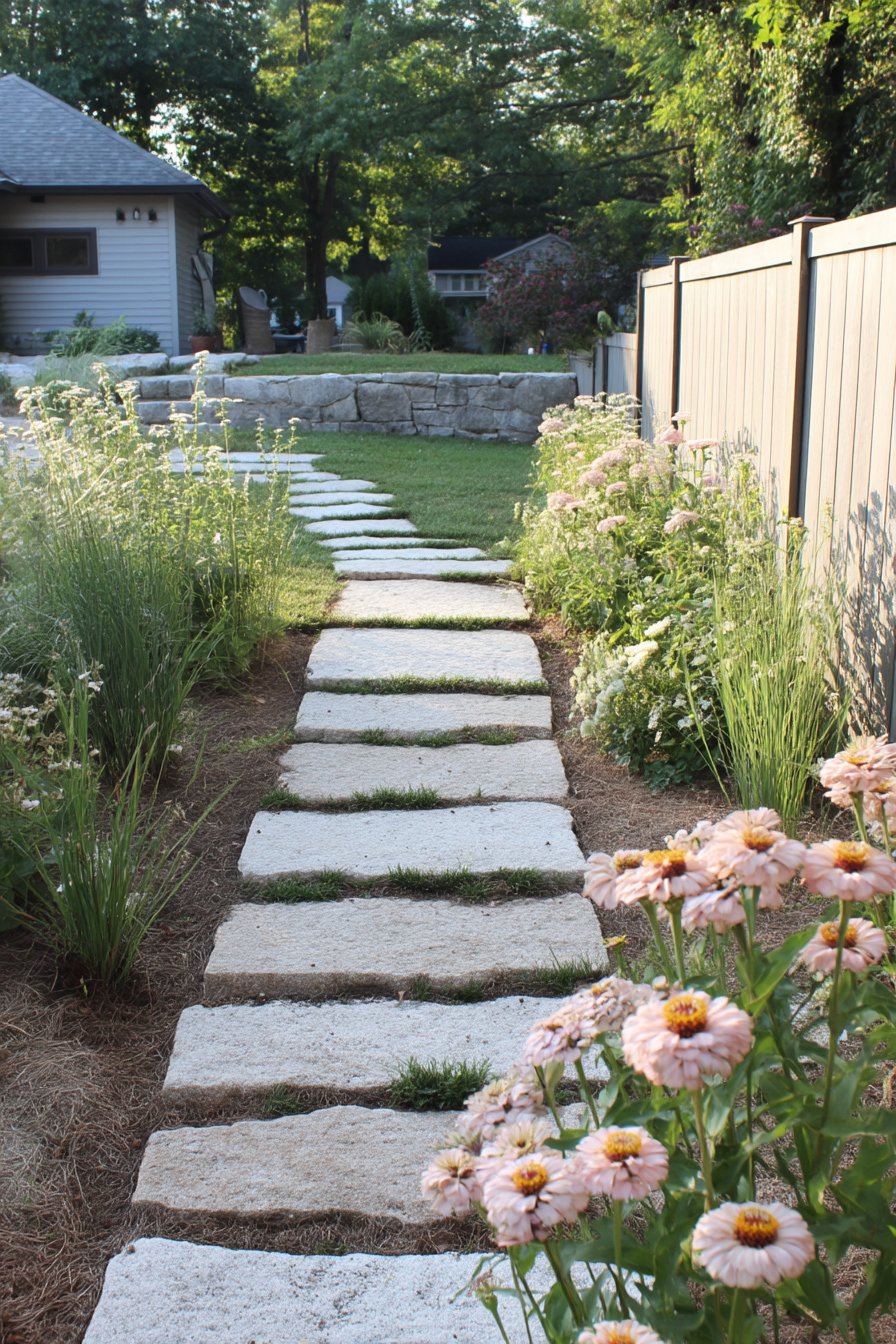 The charming natural stone pathway, bordered by cheerful daisies, creates a welcoming atmosphere that invites exploration. To replicate this look, consider using irregular stone pavers and planting like daisies for vibrant seasonal blooms.