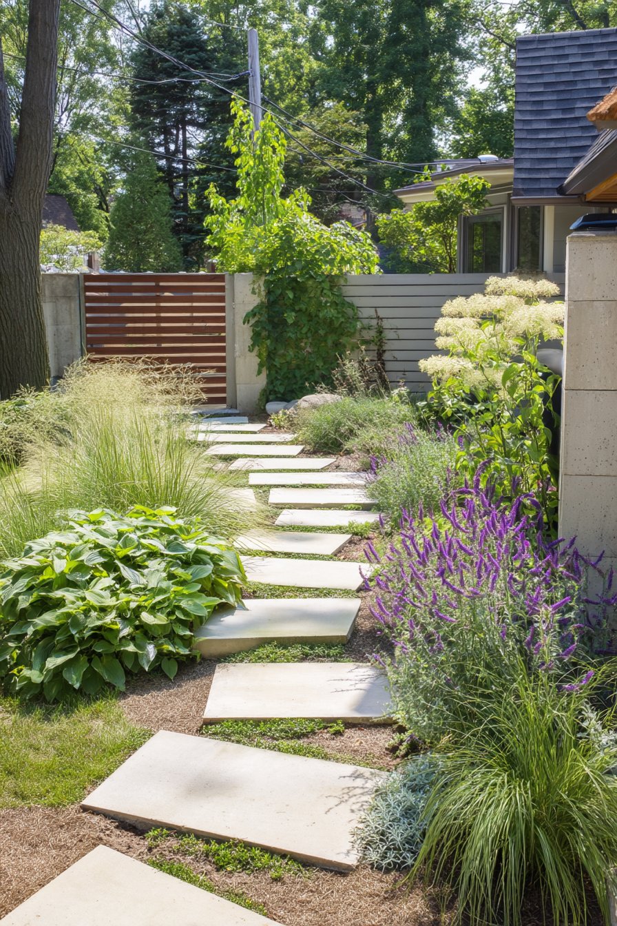 A contemporary pathway adorned with lush lavender creates a serene, inviting atmosphere, while the textured stone slabs guide visitors through the garden. To replicate this look, combine low-maintenance plants like hostas and ornamental grasses with strategically placed stepping stones for a modern yet natural feel.