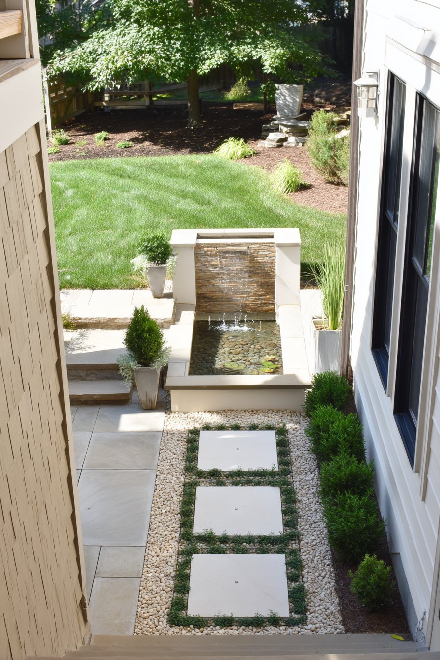 The sleek stone pathway, bordered with vibrant green ground cover, creates a striking contrast against the tranquil water feature that invites relaxation. To replicate this look, incorporate low-maintenance plants like boxwoods and use natural stone for pathways to enhance the modern aesthetic.