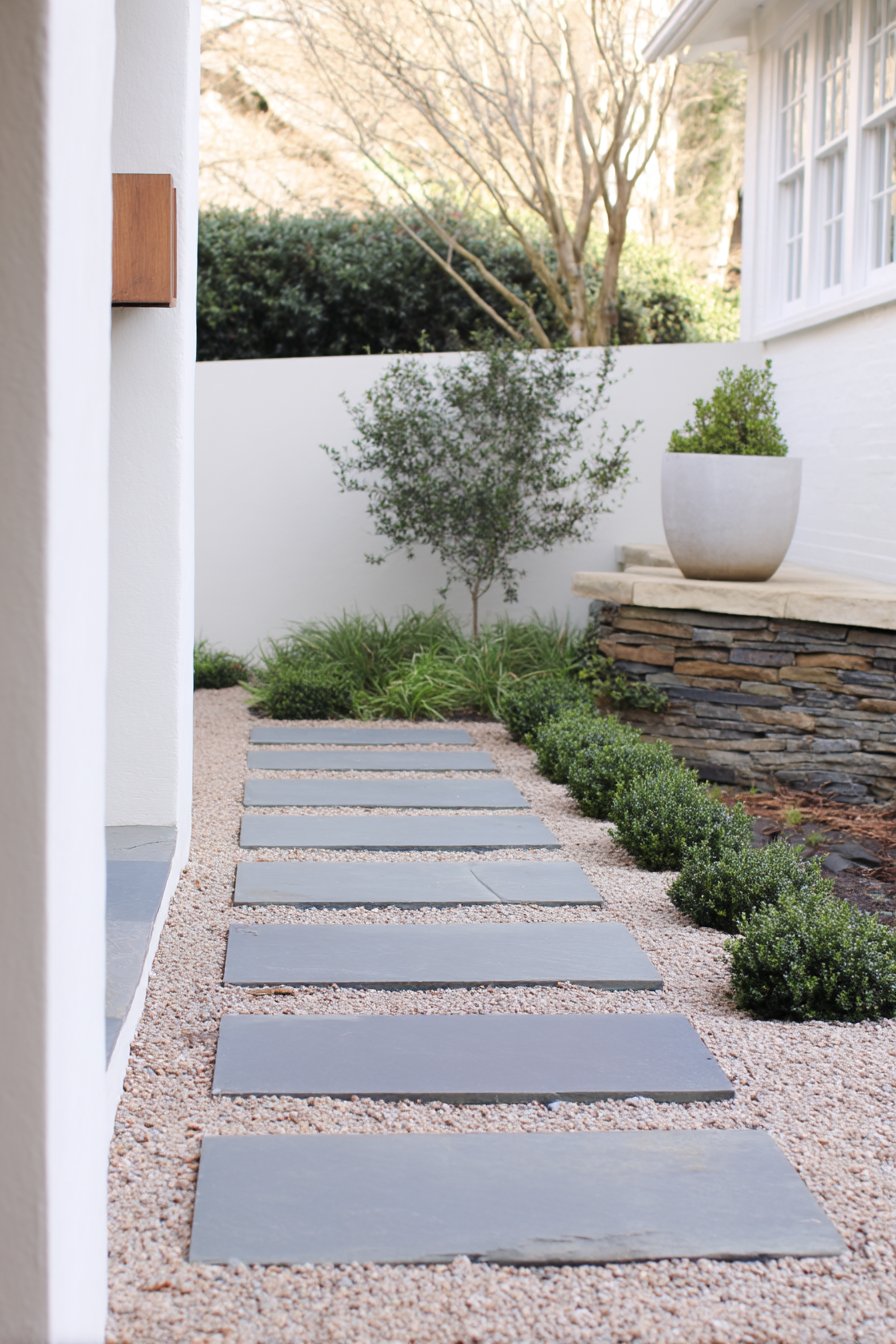 22) Contemporary Stepping Stones with Boxwood Hedge