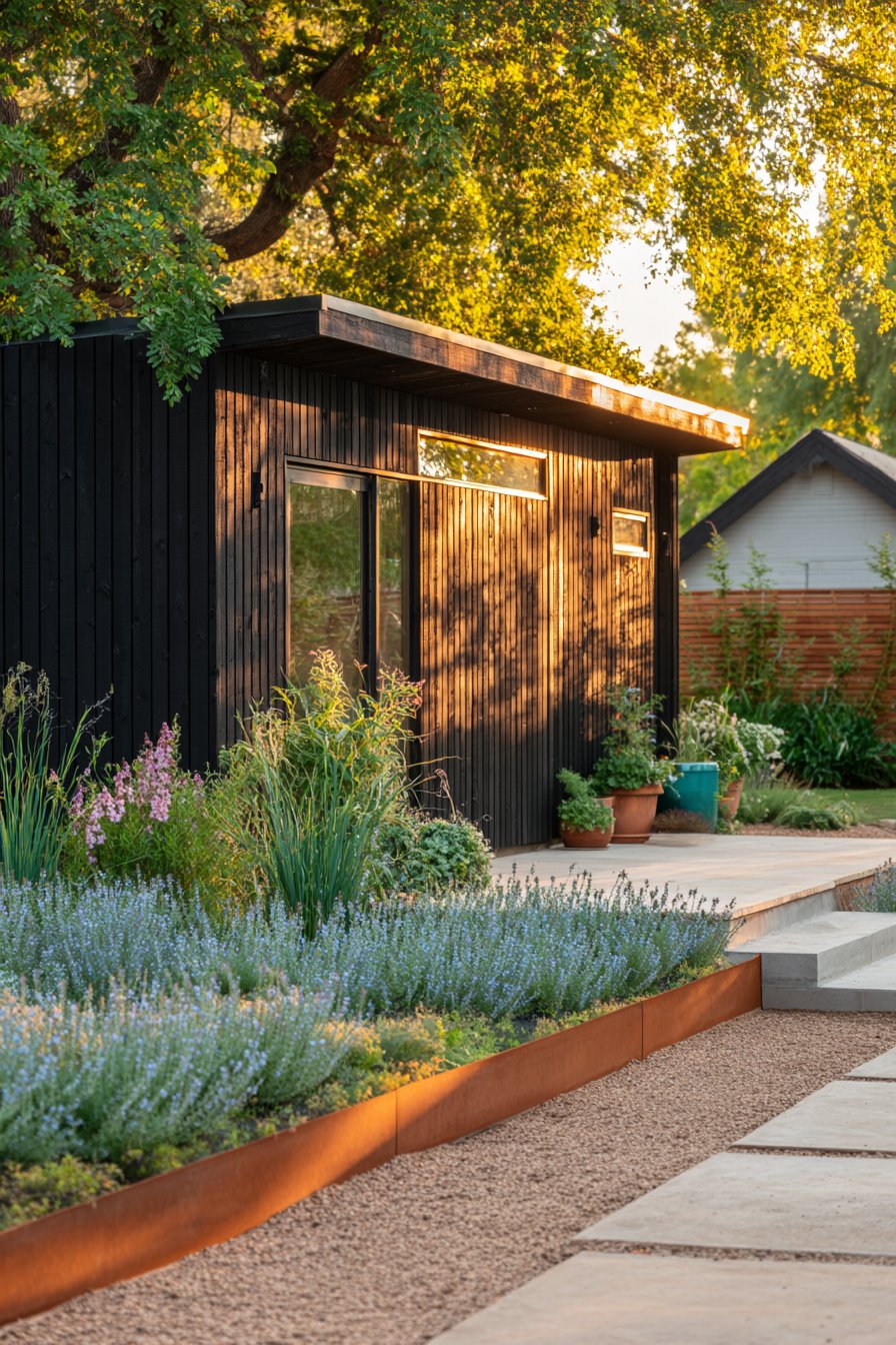 The sleek black shed blends beautifully with vibrant plantings of lavender and white flowers, creating a striking contrast. This modern look works well in minimalist gardens, while adding warm tones with wood accents can soften the overall style.