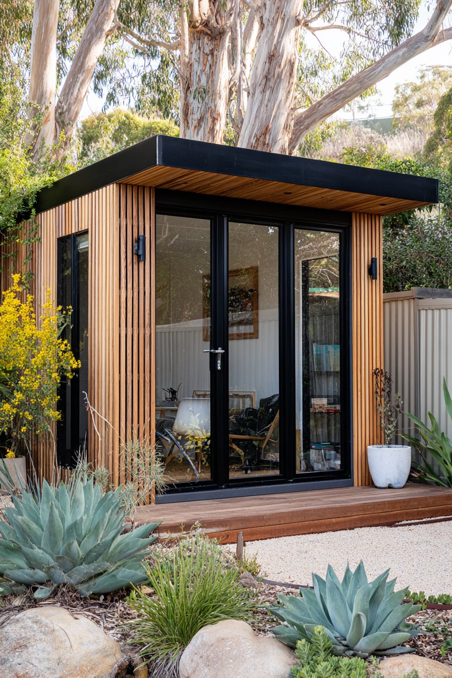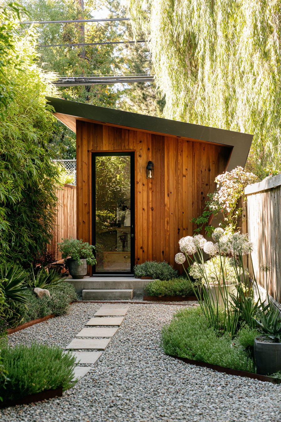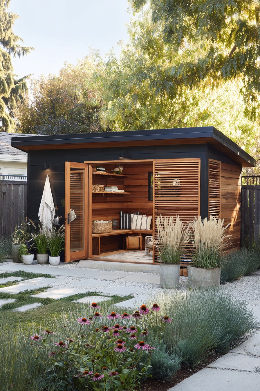 This modern garden shed features warm wooden textures with sleek black accents, creating a stylish contrast that fits perfectly in a contemporary garden. Surround it with succulents and vibrant flowers for a pop of color, and use natural materials to keep the look cohesive.