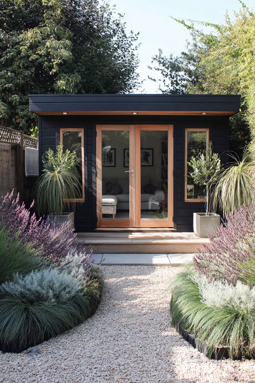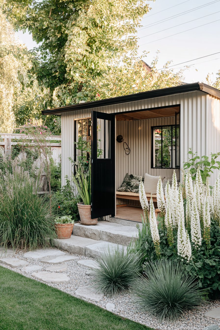 This modern shed combines sleek black wood with warm wooden accents, creating a striking contrast that’s both stylish and inviting. Surround it with low-maintenance plants like lavender and ornamental grasses for a contemporary garden that feels fresh and vibrant.
