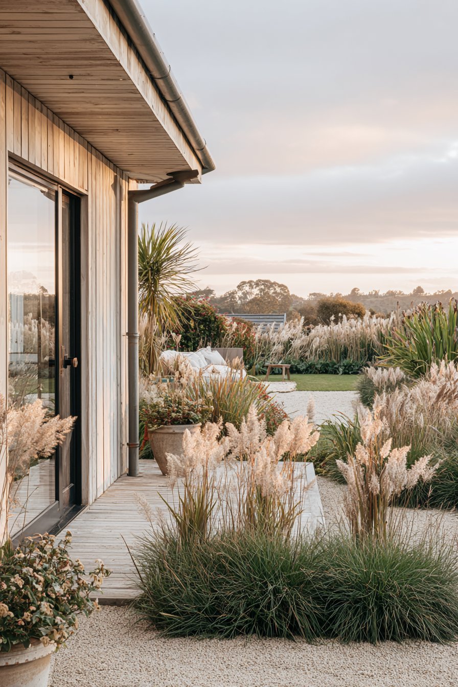 The shed’s natural wood finish blends beautifully with soft greens and light neutrals, creating a serene vibe perfect for a modern garden. To achieve this look, use native grasses and low-maintenance plants in stylish pots for a fresh, inviting space.