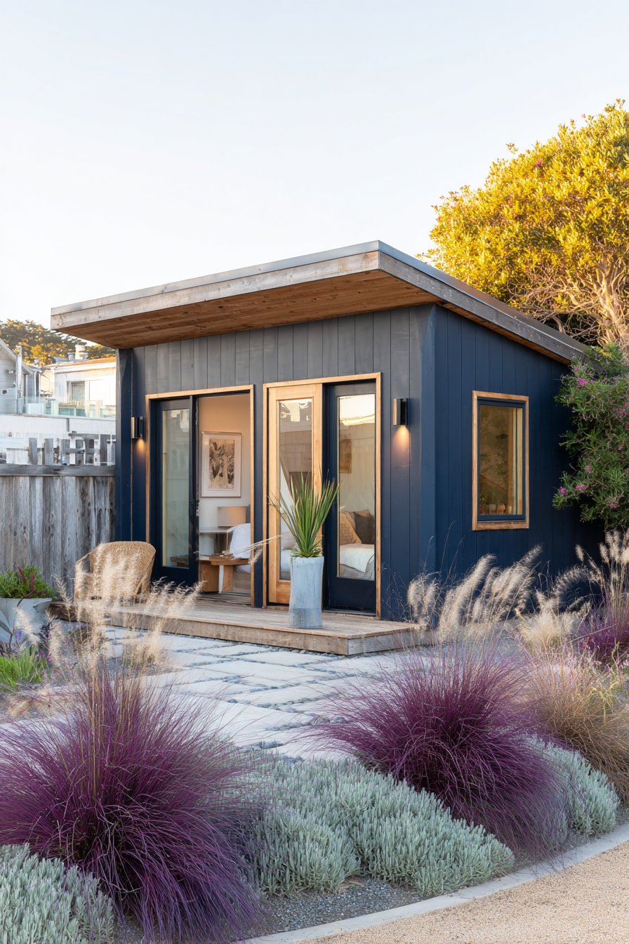 This modern garden shed features a sleek navy exterior with warm wood accents, creating a striking contrast that adds depth. Pair it with drought-tolerant plants like ornamental grasses and lavender for a low-maintenance, stylish garden perfect for contemporary spaces.