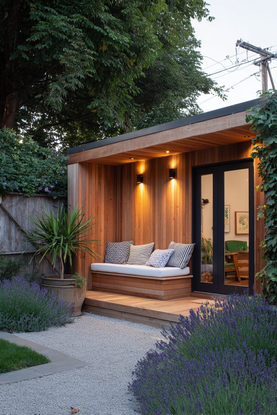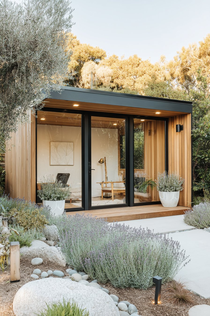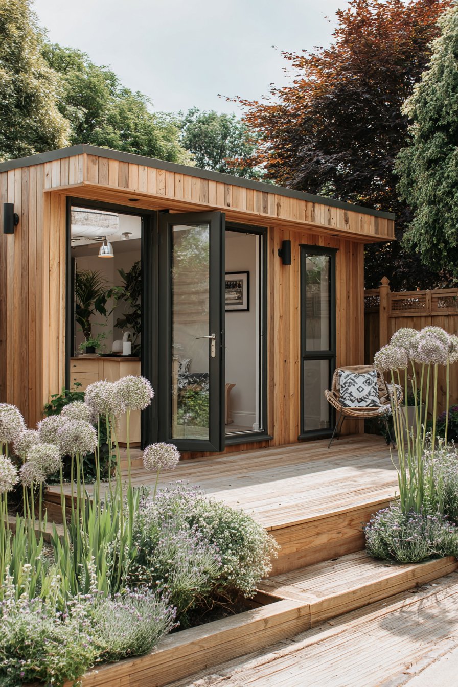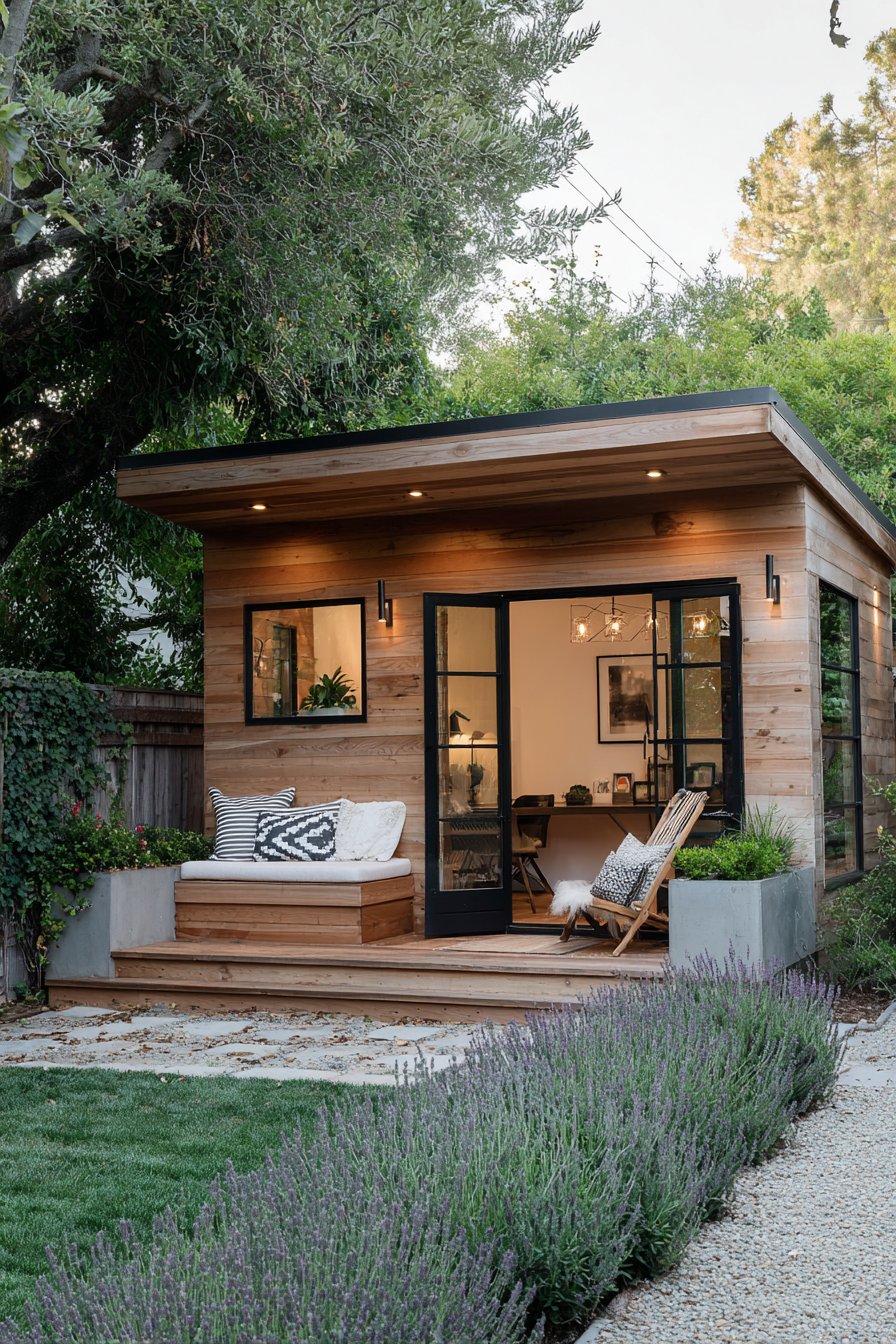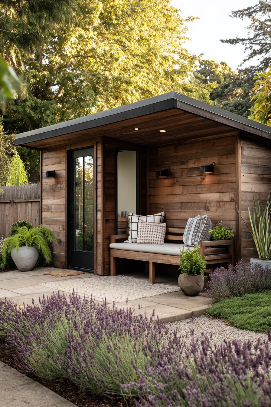 This modern wooden shed blends natural textures with sleek lines, creating a cozy retreat perfect for relaxing or working. Pair warm wood tones with soft lavender plantings for a calming garden vibe, ideal for contemporary spaces but may clash with more traditional styles.