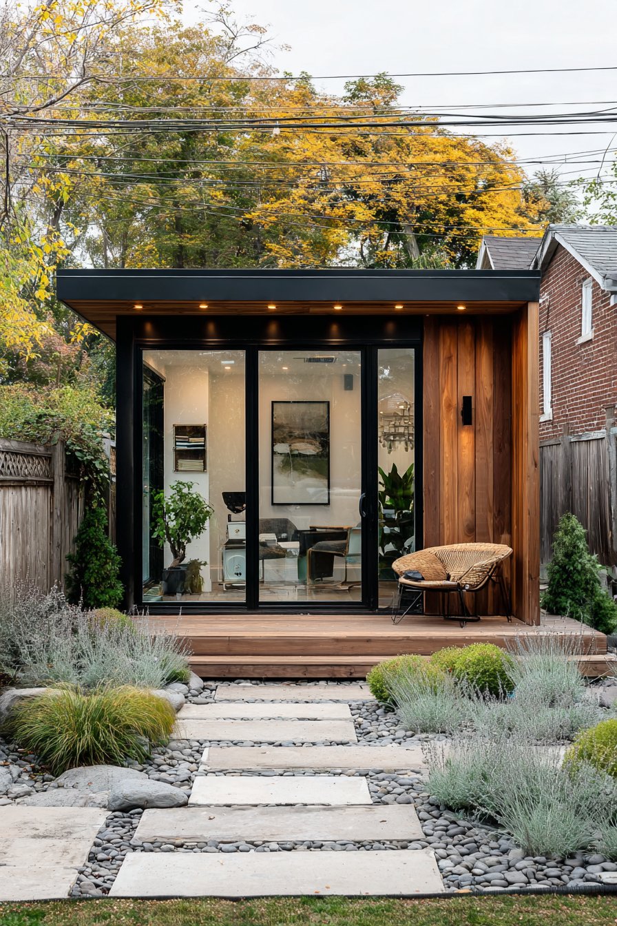 This sleek garden shed combines warm wood tones with modern black accents, creating a stylish focal point in any outdoor space. To achieve this look, pair minimalist furniture with drought-resistant plants and clean stone pathways for a chic, low-maintenance garden.