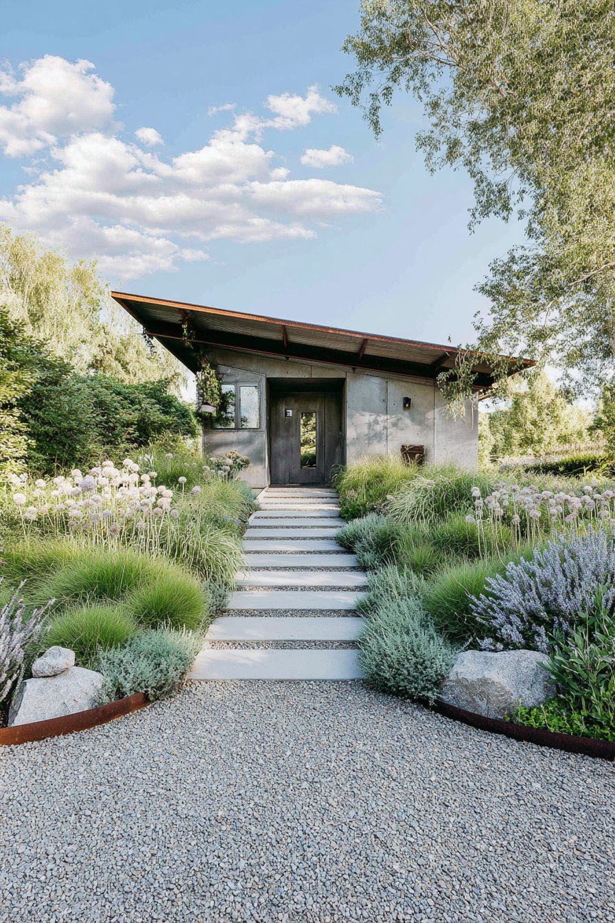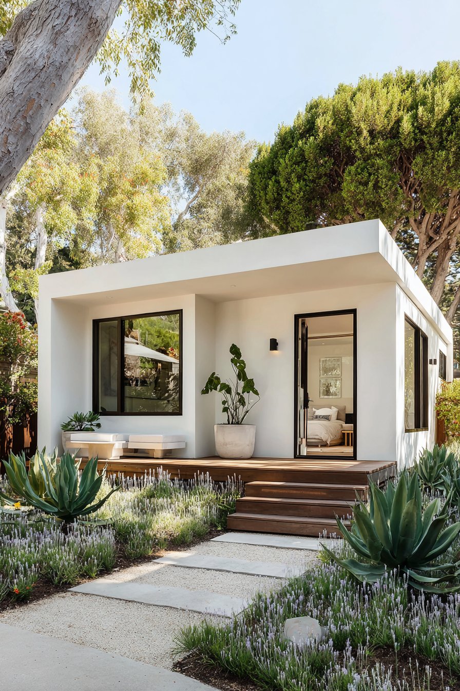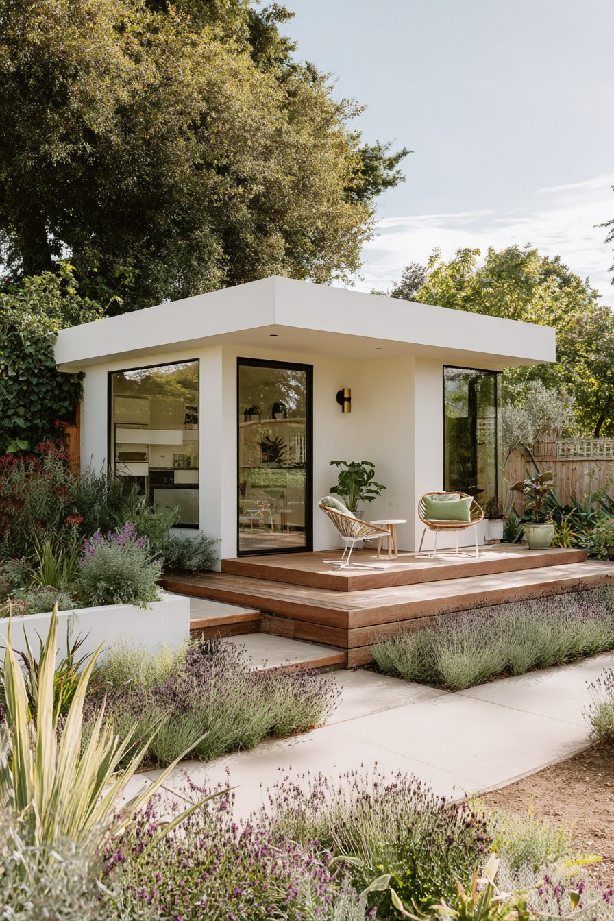 The sleek white facade and large windows create a fresh, modern vibe that fits beautifully in minimalist gardens. To achieve this look, use simple lines, neutral colors, and low-maintenance plants like succulents and lavender.