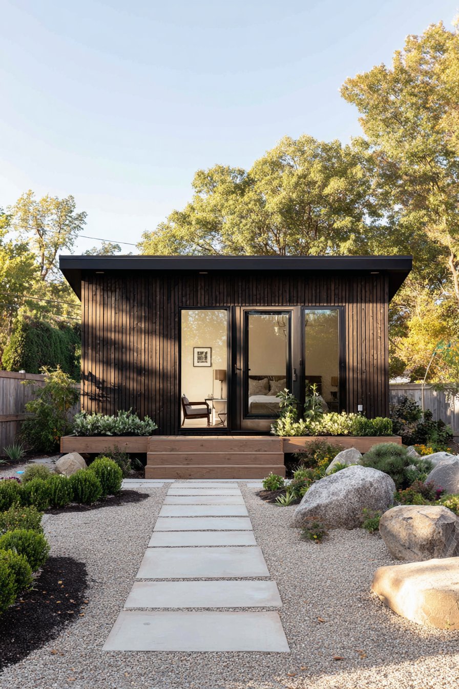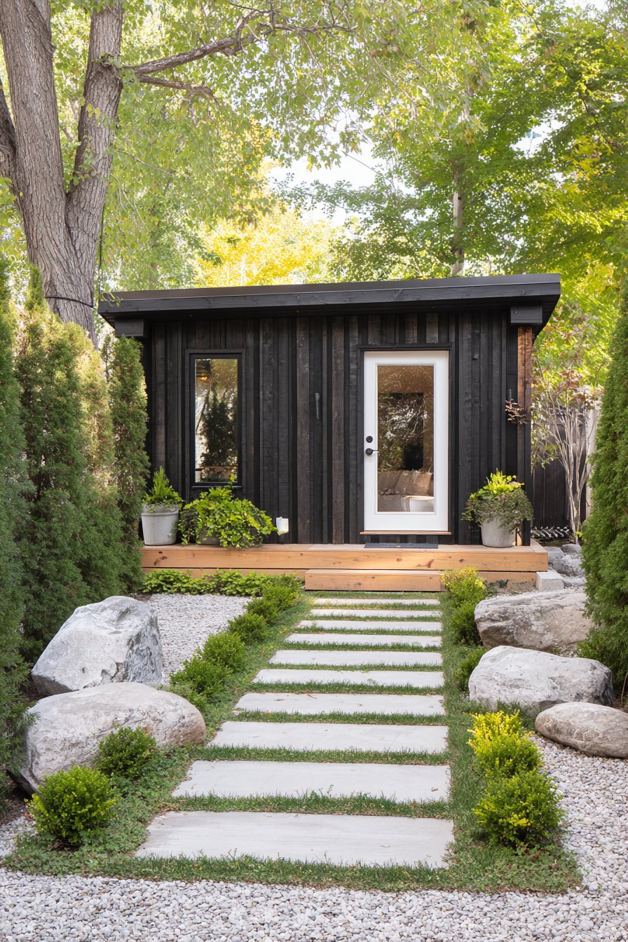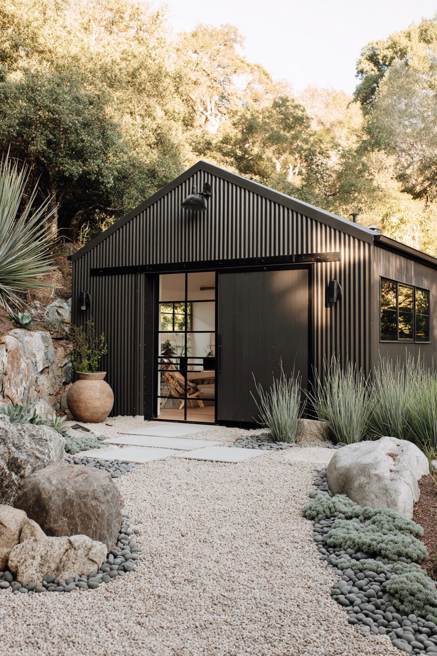 The sleek black shed blends modern design with natural elements, creating a striking focal point in a minimalist garden. Use smooth pebbles, drought-tolerant plants, and warm materials to achieve a similar stylish and functional outdoor space.