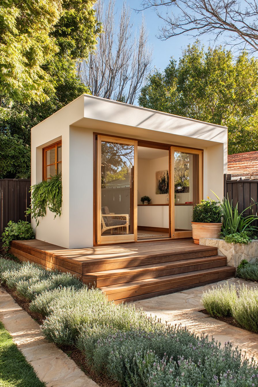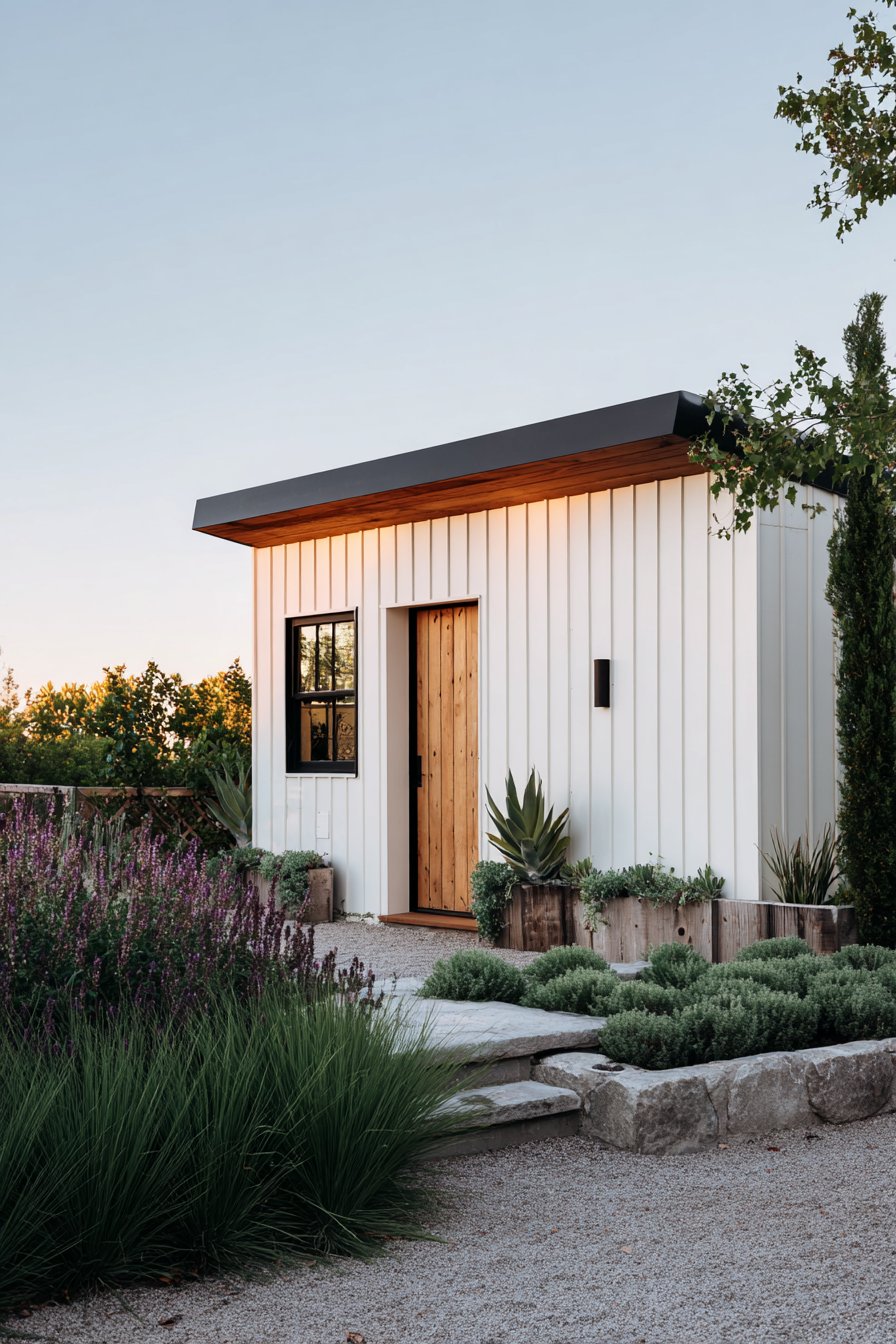 The sleek, white exterior and warm wooden accents create a calm, inviting space perfect for a modern garden. Pair this style with low-maintenance plants like lavender and succulents for a fresh, minimalistic look that fits well in contemporary gardens.