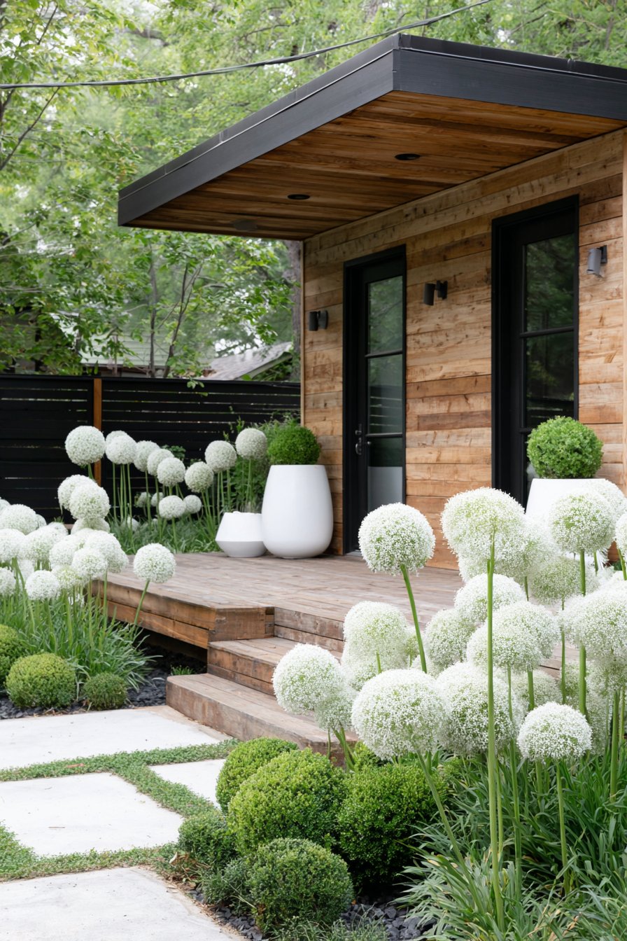 The modern wooden shed blends beautifully with its natural surroundings, featuring warm wood tones and sleek black accents for a contemporary look. To achieve this style, use white planters and round, fluffy plants for a clean, organized garden that works well in minimalist spaces.