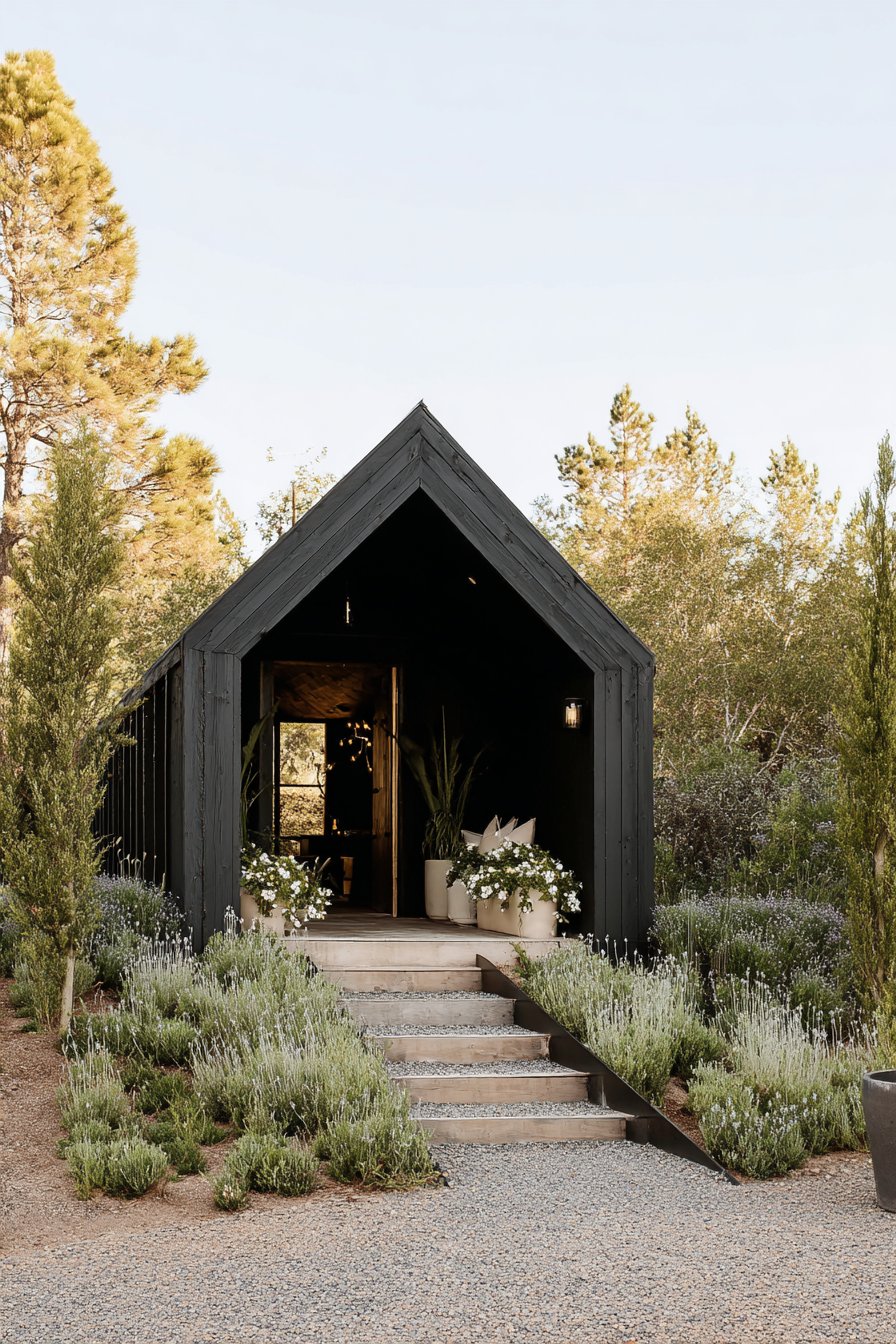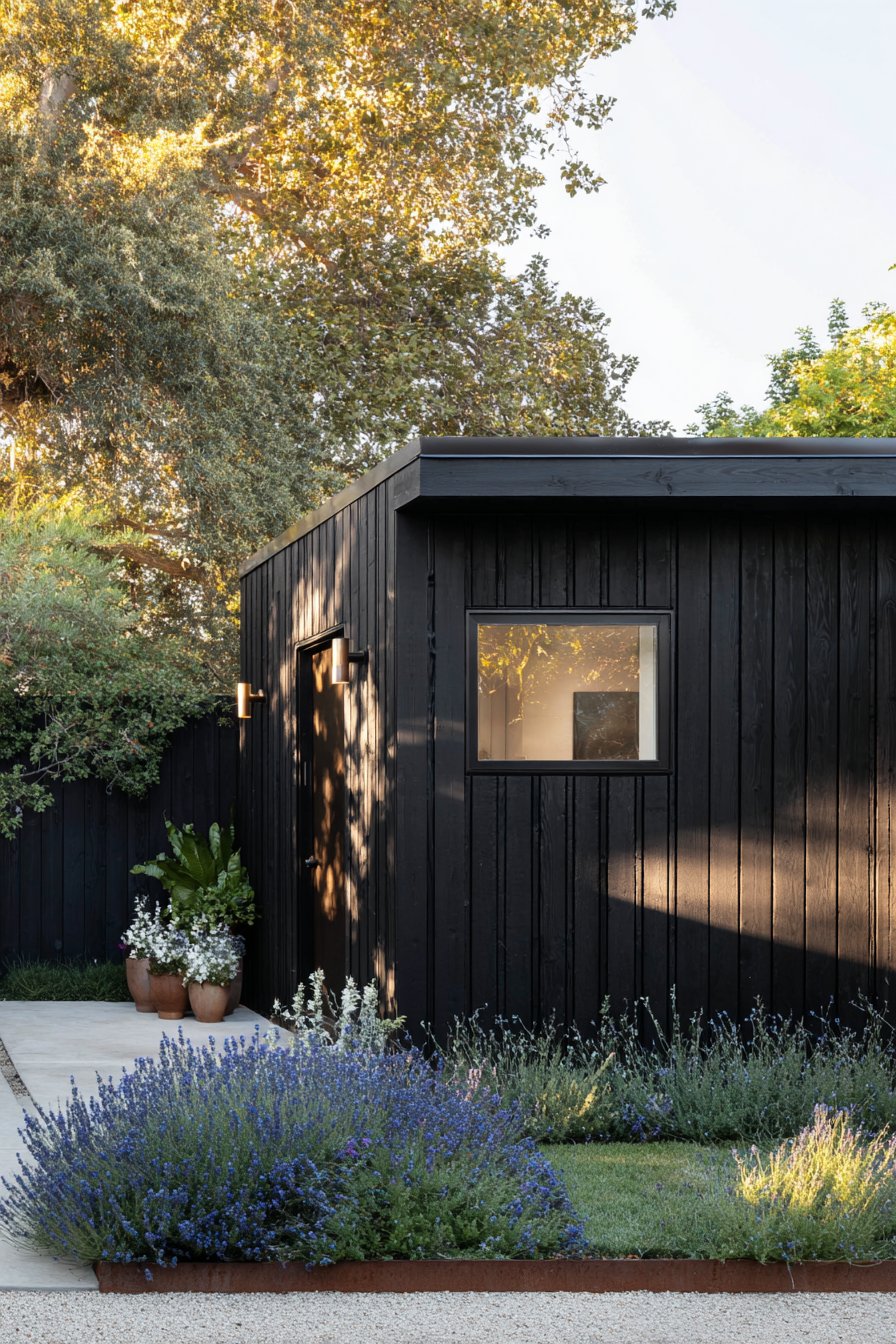 The sleek black exterior of the shed adds a modern touch, while the soft white flowers and lavender create a lovely contrast. For a similar vibe, use dark colors for structures and pair them with light, fragrant plants to enhance the overall appeal.