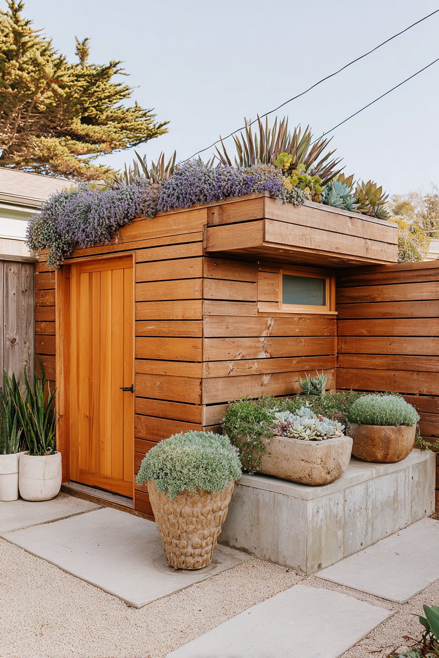 This modern garden shed features warm wooden tones and a lush succulent roof that brings life to any outdoor space. To recreate this look, use drought-tolerant plants and simple, clean lines that fit perfectly in a contemporary garden.