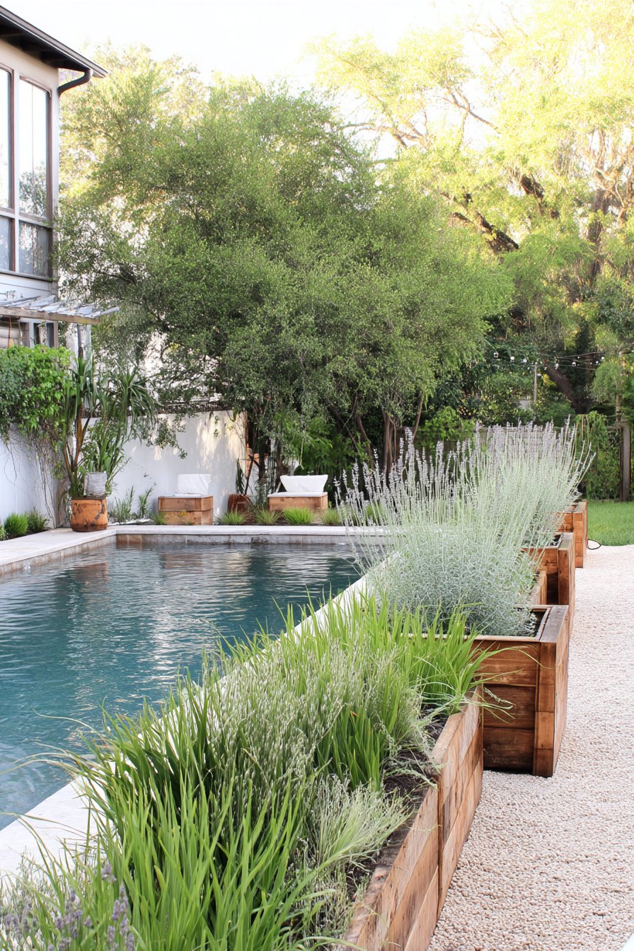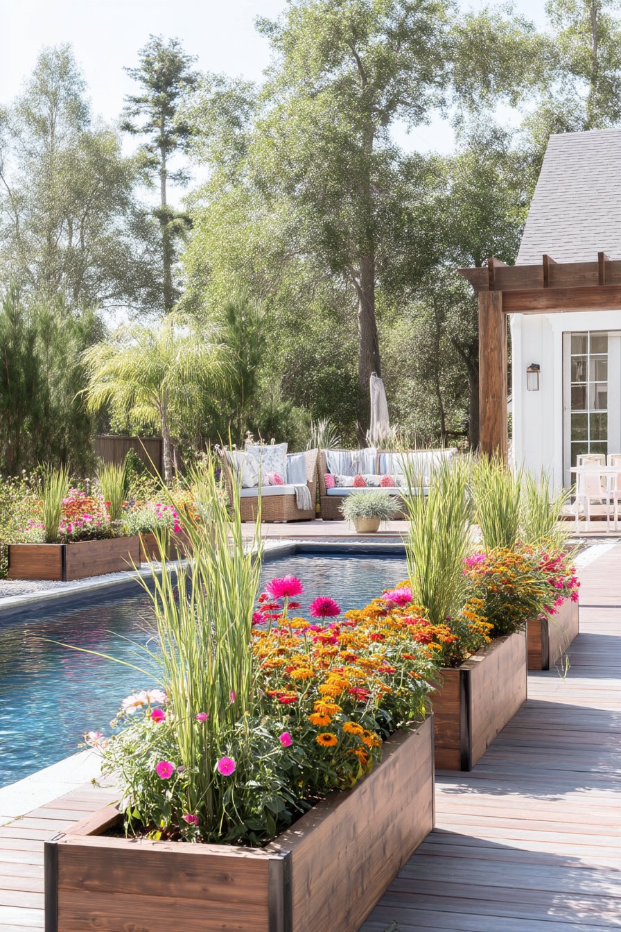Vibrant zinnias, cheerful marigolds, and elegant grasses create a lively atmosphere around the pool, enhancing outdoor enjoyment. To replicate this look, use rustic wooden planters and choose a mix of colorful perennials for year-round beauty.