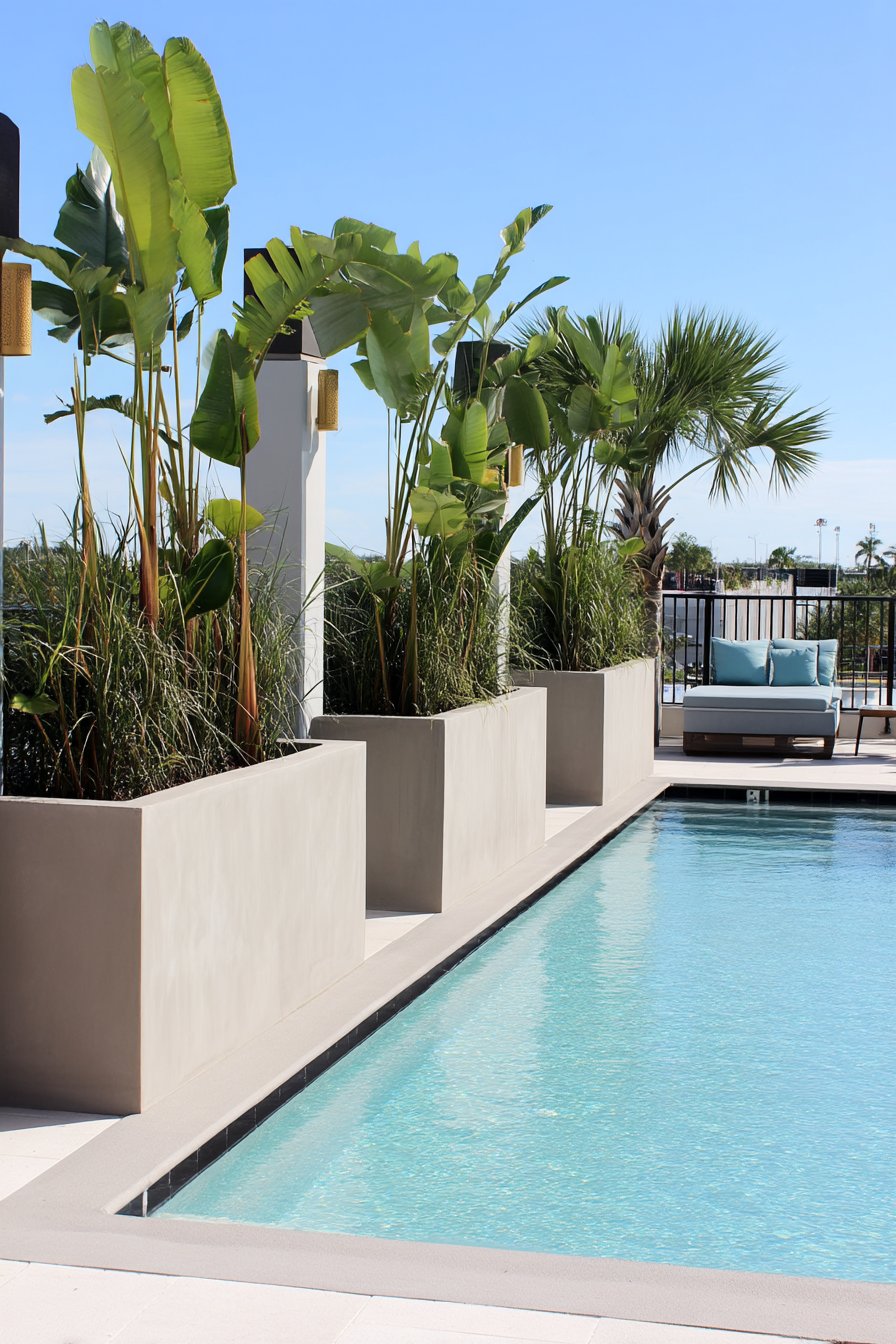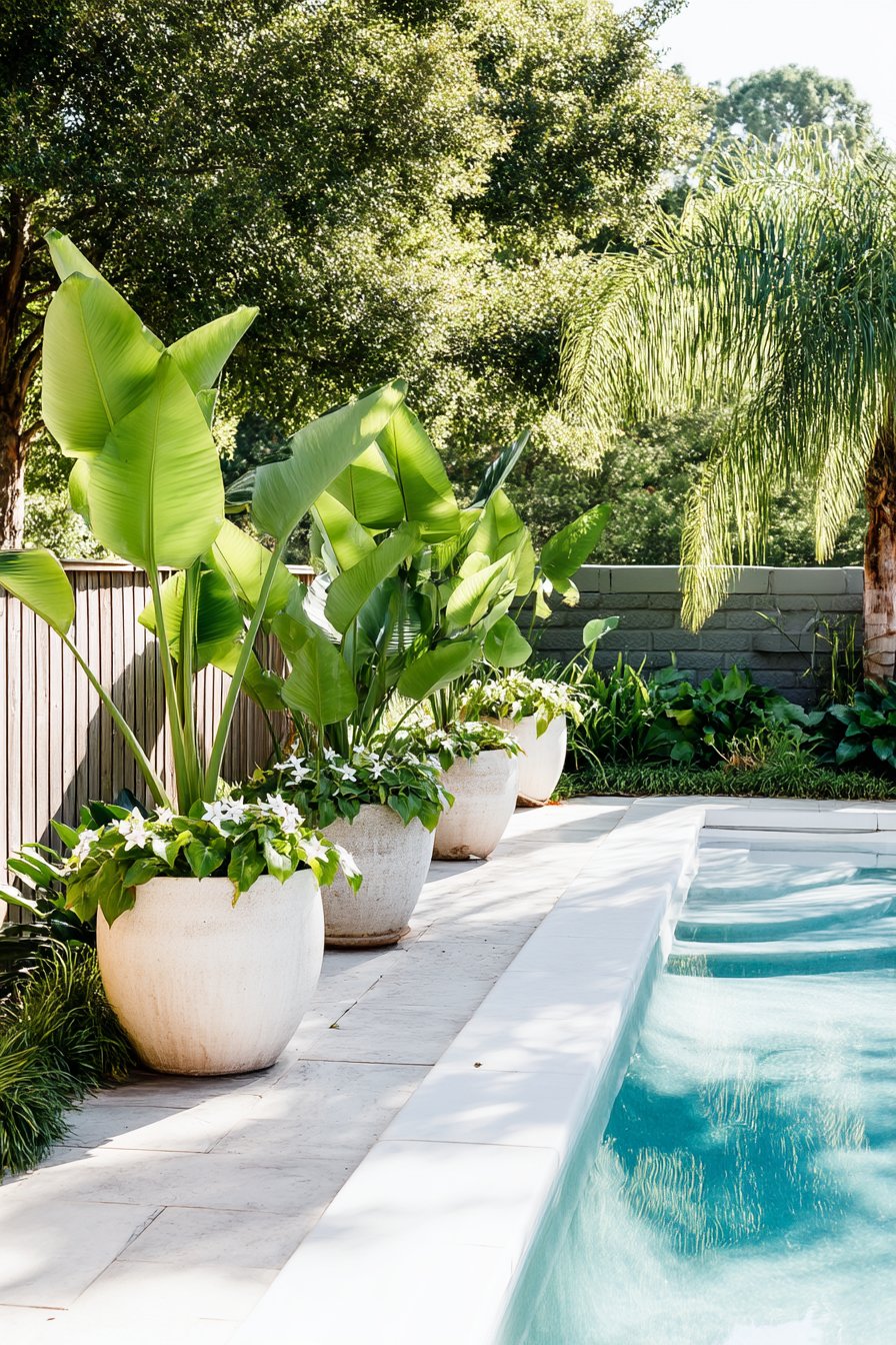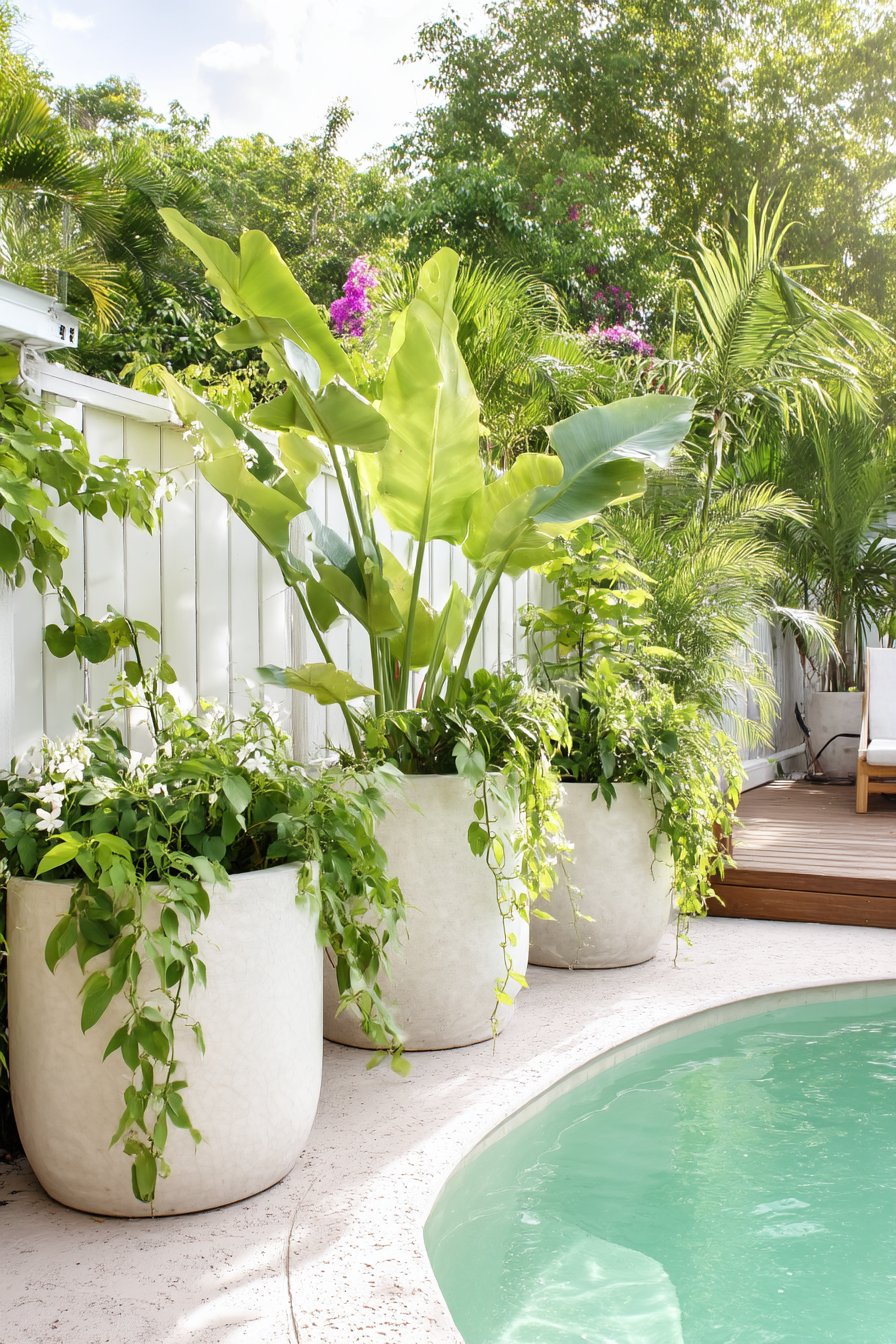5) Tropical Greenery Surrounding Elegant Poolside Planters