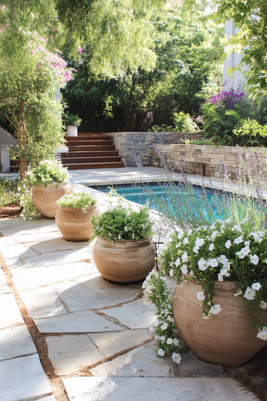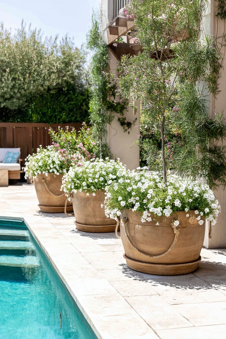 The elegant white petunias create a stunning contrast against the warm, earthy tones of the planters, enhancing the serene poolside ambiance. To replicate this look, choose large, textured pots and opt for abundant flowering plants that thrive in full sun.