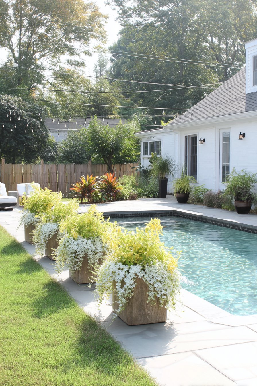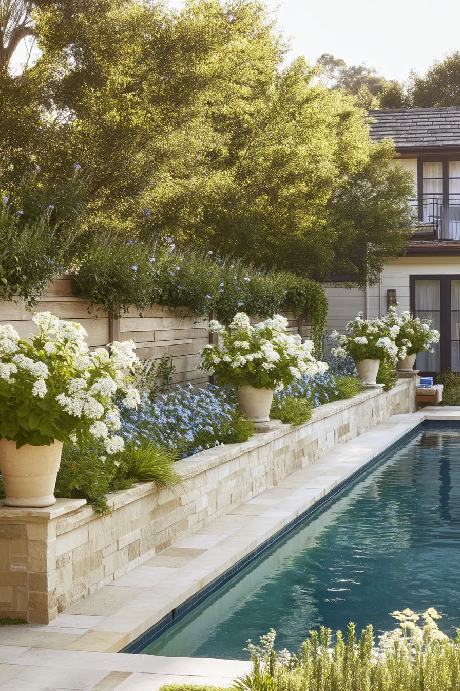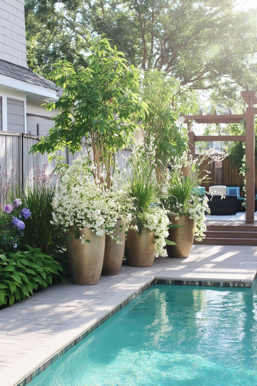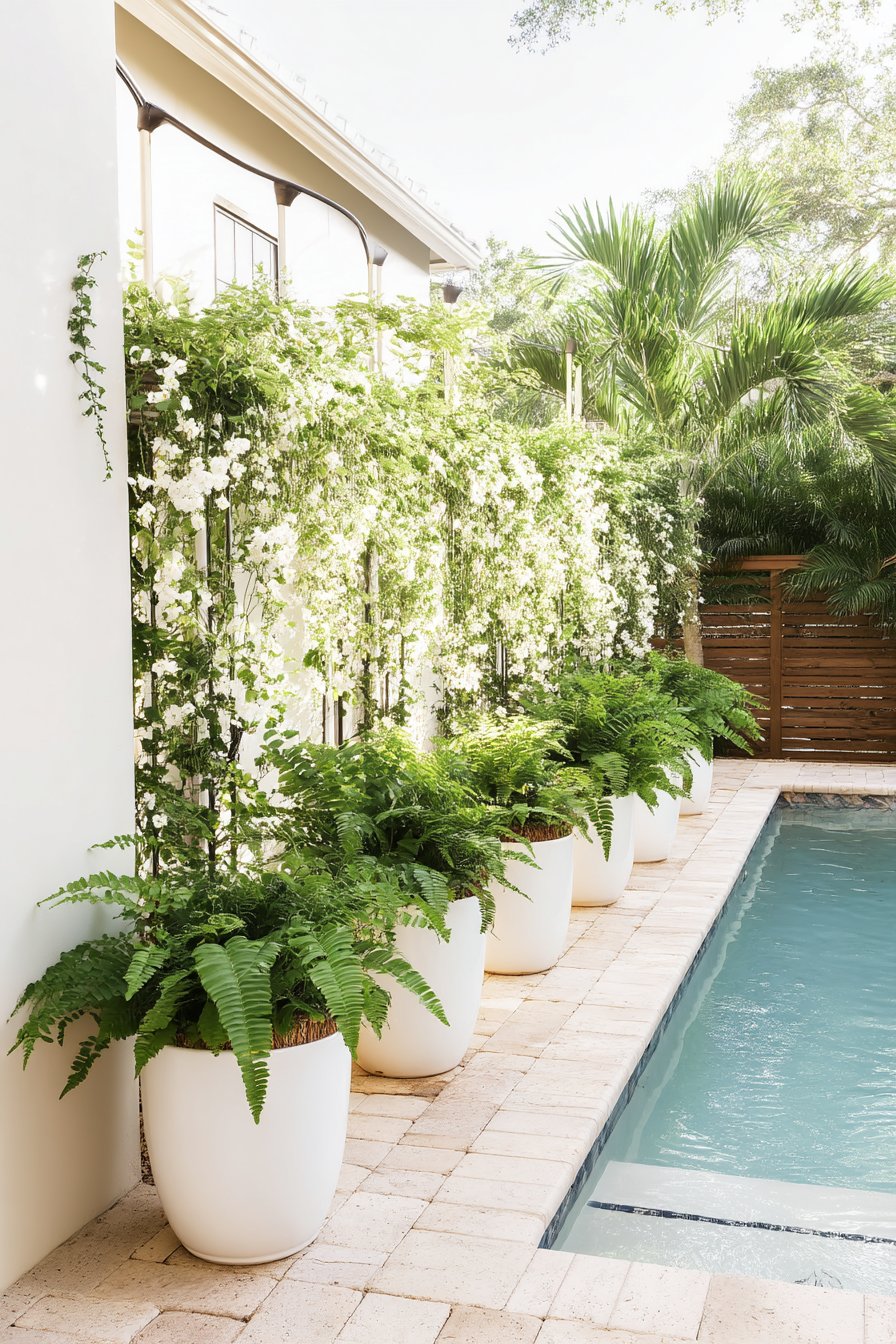 The elegant planters filled with lush greenery and cascading white blooms create a serene poolside retreat, perfect for relaxation. Consider incorporating tall grasses and vibrant hydrangeas in similar pots to achieve a balanced, inviting atmosphere.
