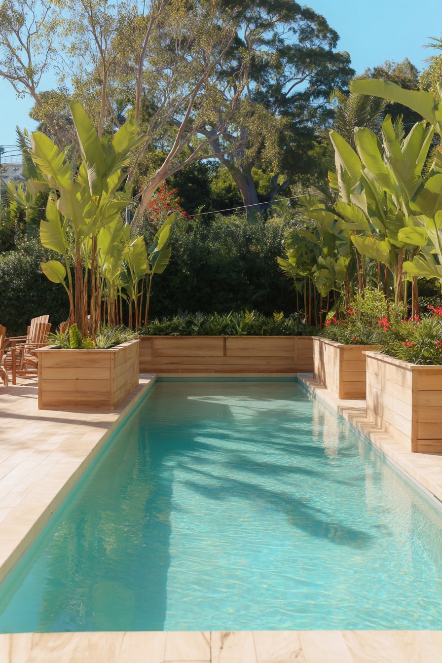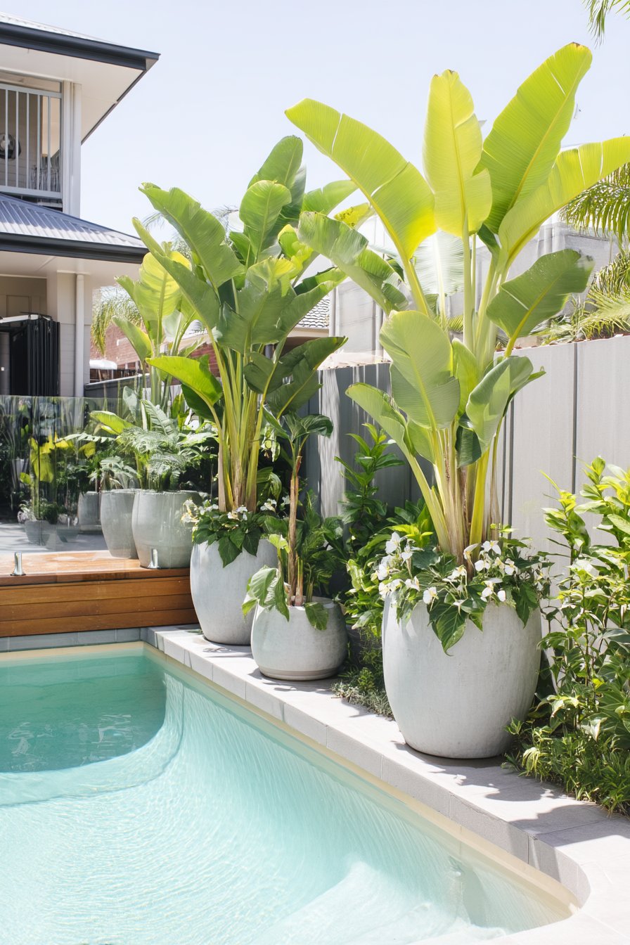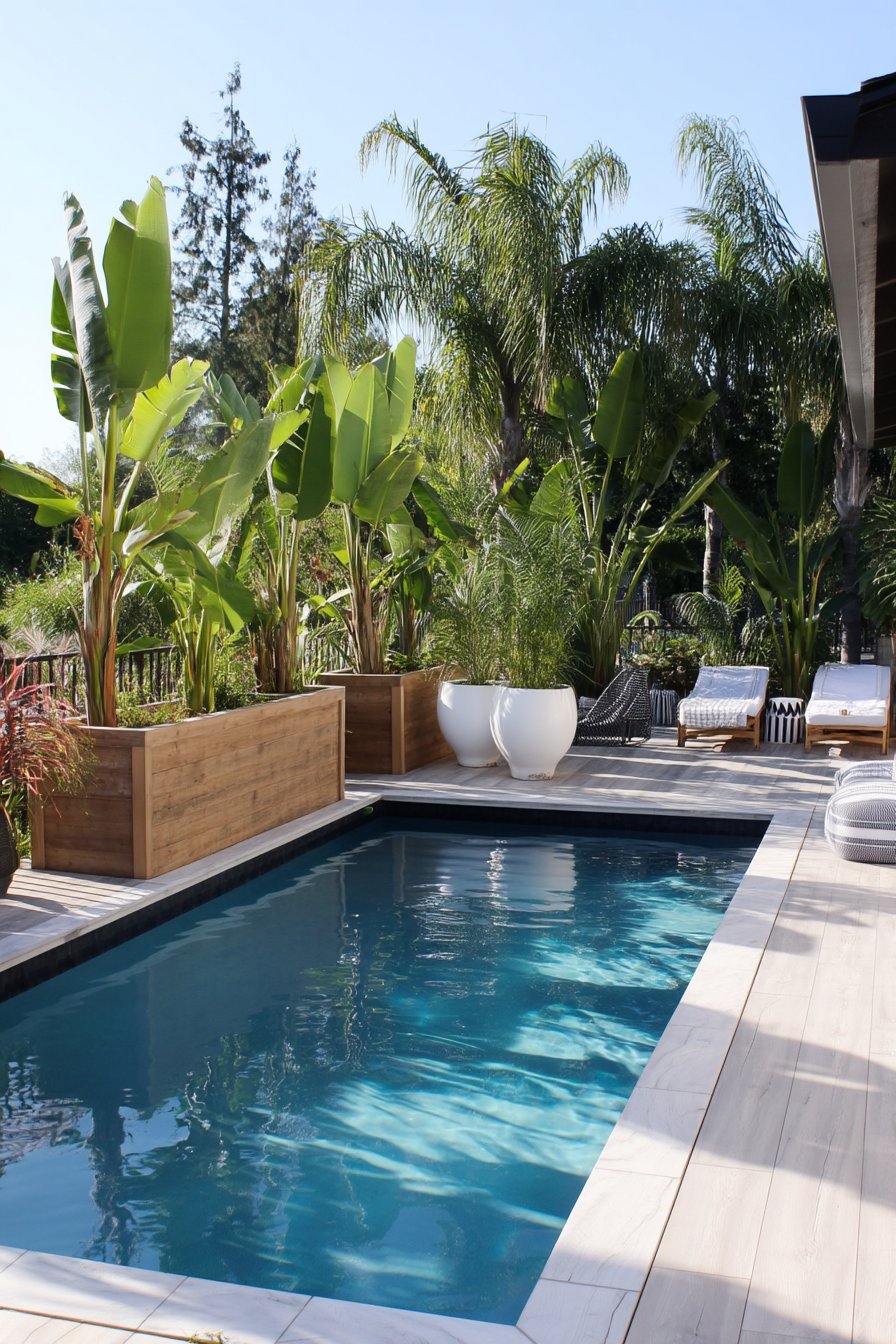 Lush banana plants and vibrant tropical foliage create a serene retreat around the pool, evoking a sense of paradise. To replicate this look, use large planters and select heat-tolerant plants like palms and ferns for a thriving garden.