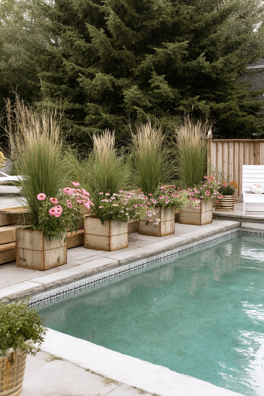 Rustic wooden planters filled with vibrant pink flowers like daisies and echinacea create a charming, inviting atmosphere around any pool area. To replicate this look, pair tall ornamental grasses with colorful blooms for height and texture, ensuring a mix of sun and for year-round interest.