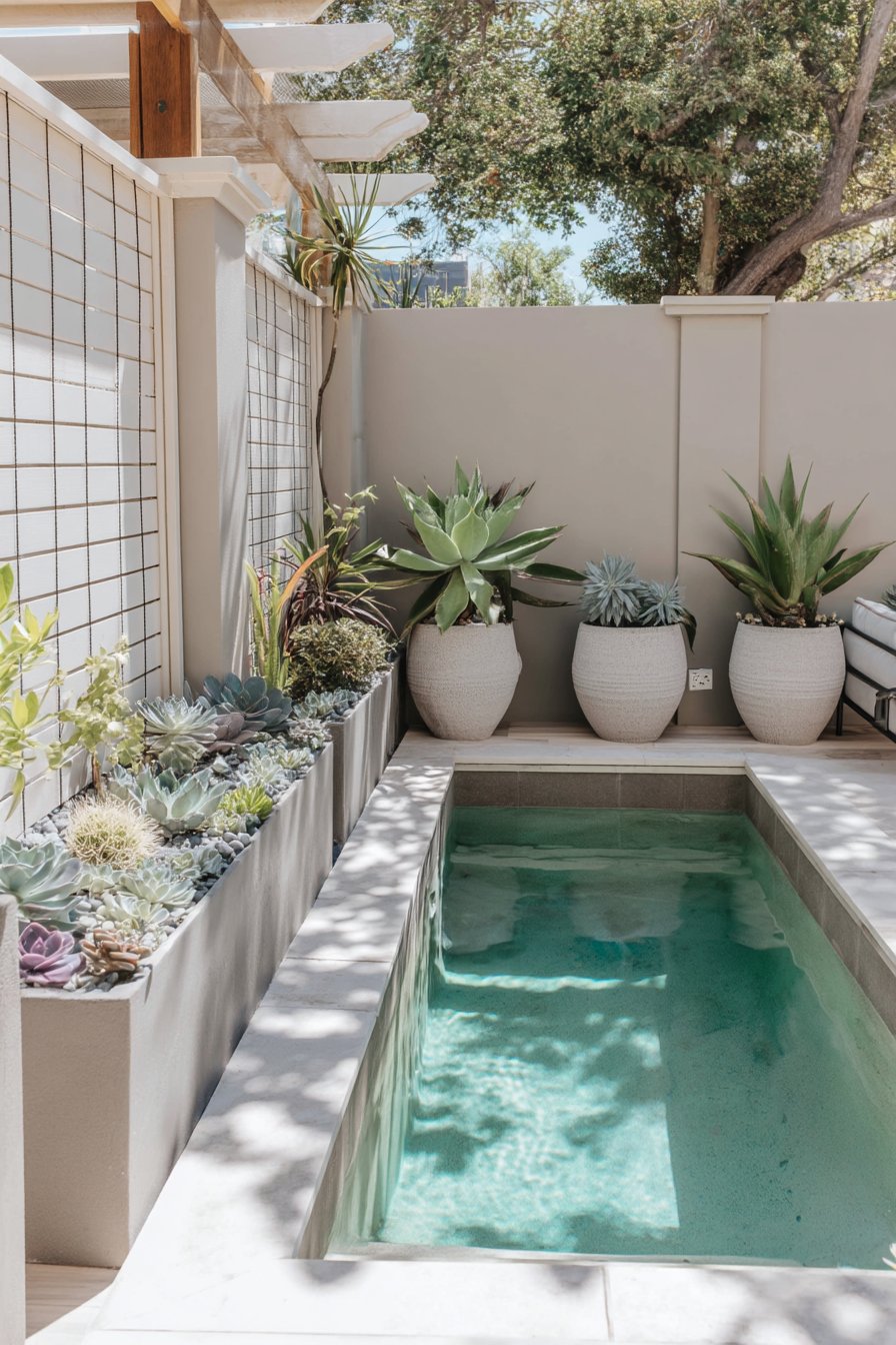 The sleek, minimalist design features soft gray planters filled with vibrant succulents, creating a serene contrast against the tranquil pool water. To replicate this look, choose like Echeveria and Sedum, and opt for simple, modern containers.