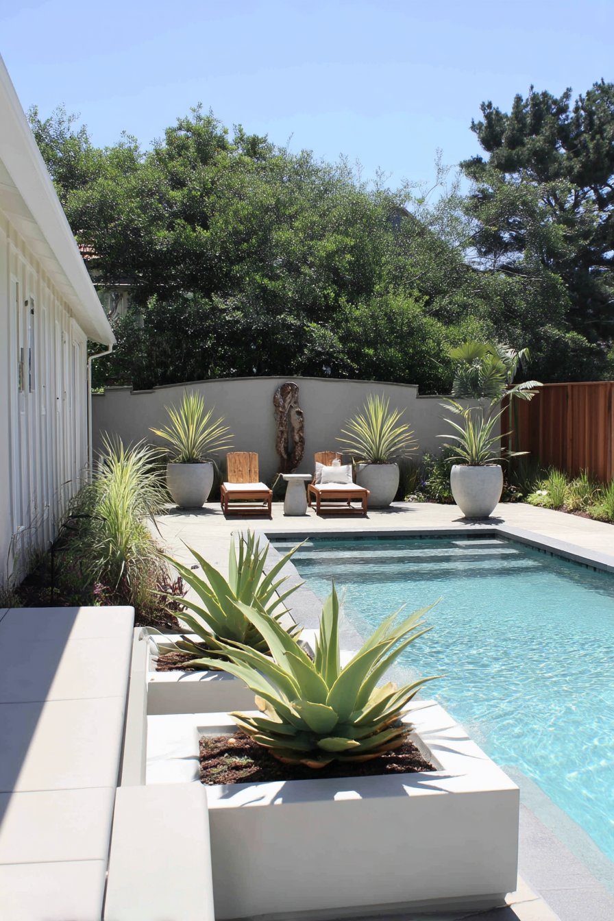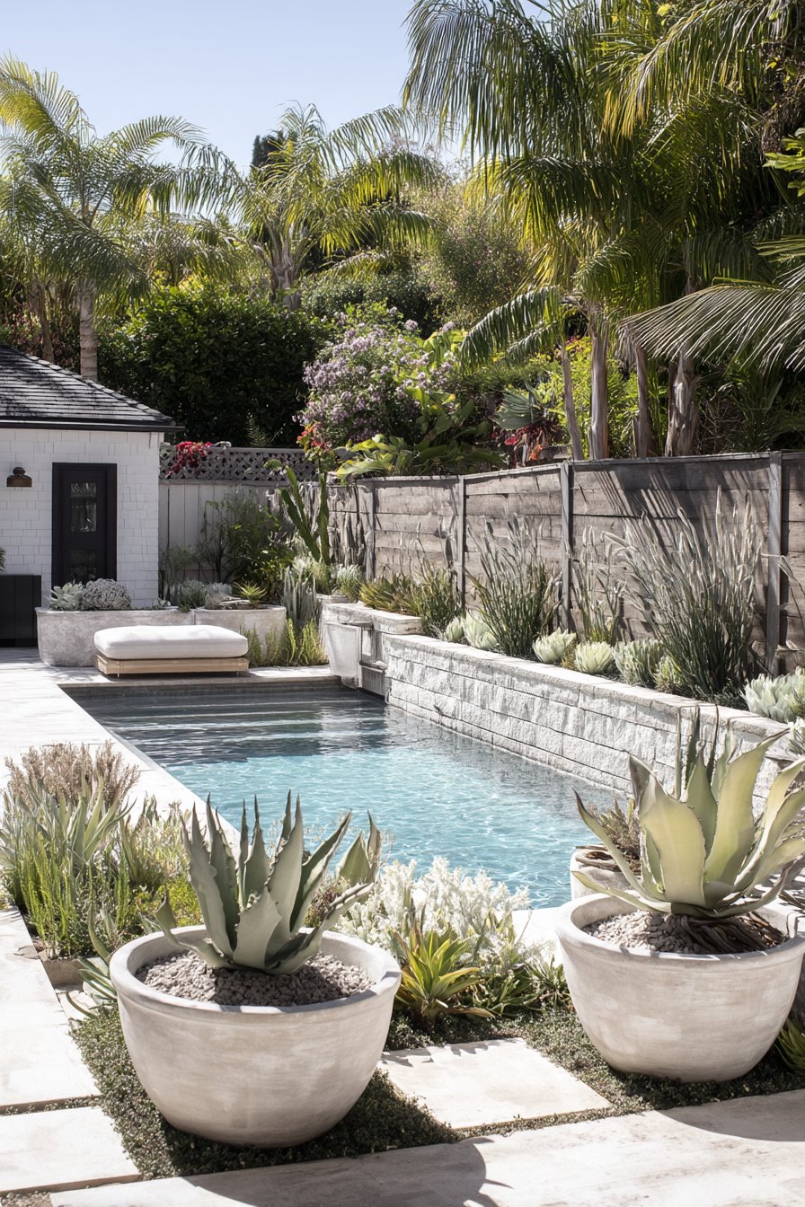 The combination of striking agave plants and sleek, modern planters creates a stunning focal point that harmonizes with the poolside ambiance. To achieve this look at home, opt for drought-tolerant succulents and stylish containers that complement your outdoor decor.