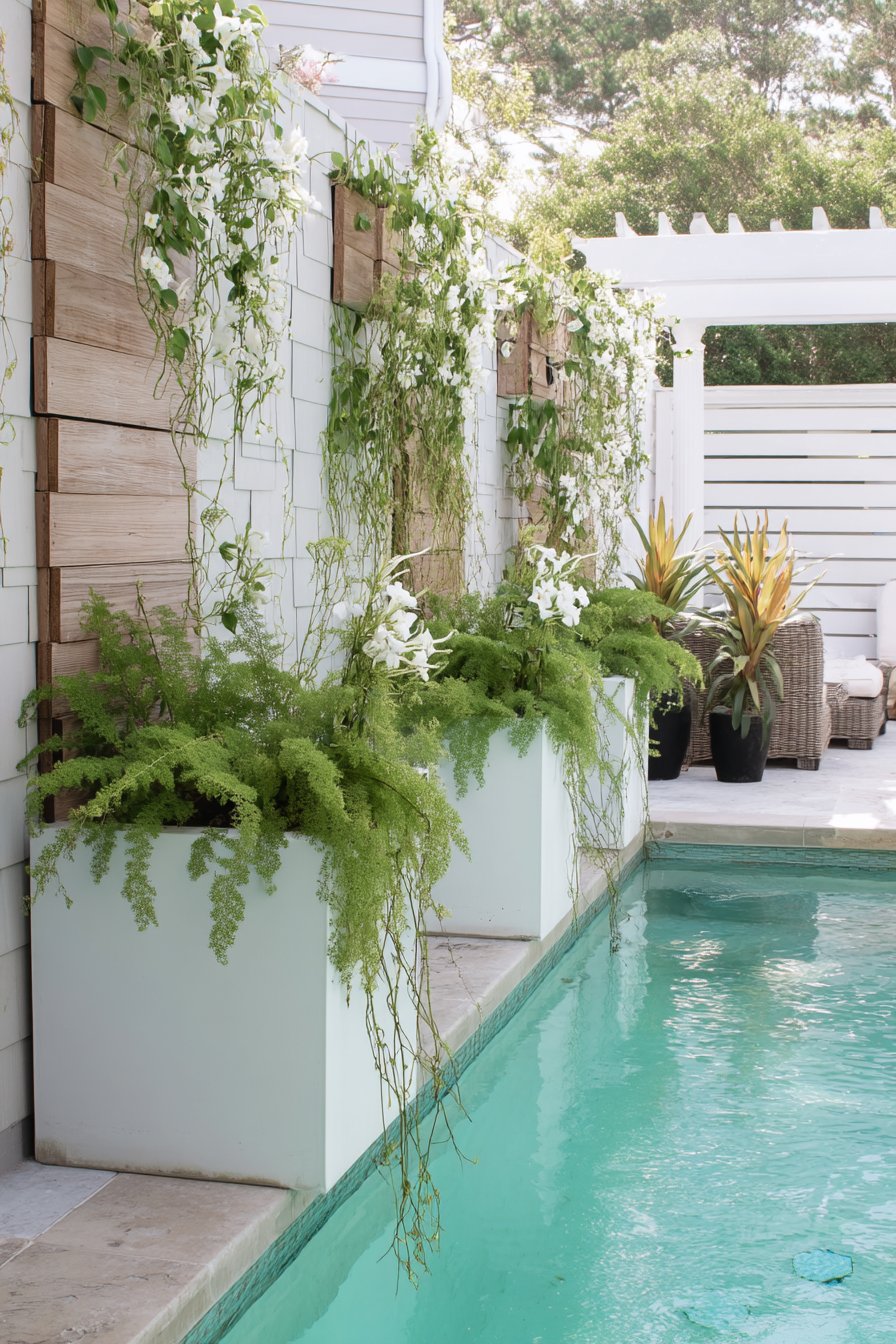 The combination of lush white blooms and vibrant green foliage creates a refreshing contrast, perfect for a serene poolside retreat. To replicate this look, use cascading plants like sweet potato vine alongside white petunias in rustic wooden planters for added texture.