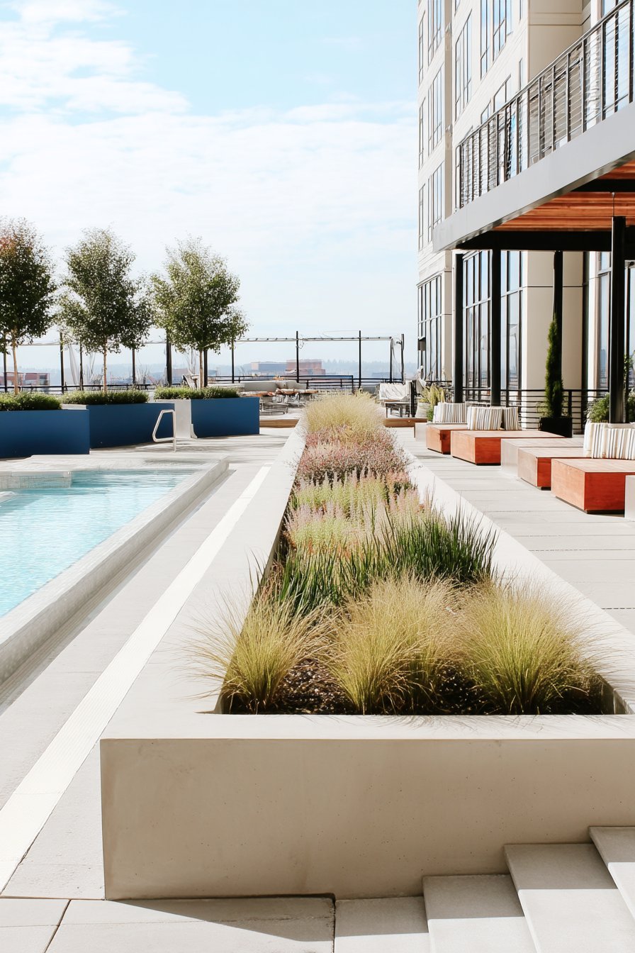 The sleek lines of this design beautifully integrate soft ornamental grasses with vibrant accents, creating a serene poolside retreat. To replicate this look, consider using low-maintenance plants like fountain grass and lavender for a modern, minimalist aesthetic.