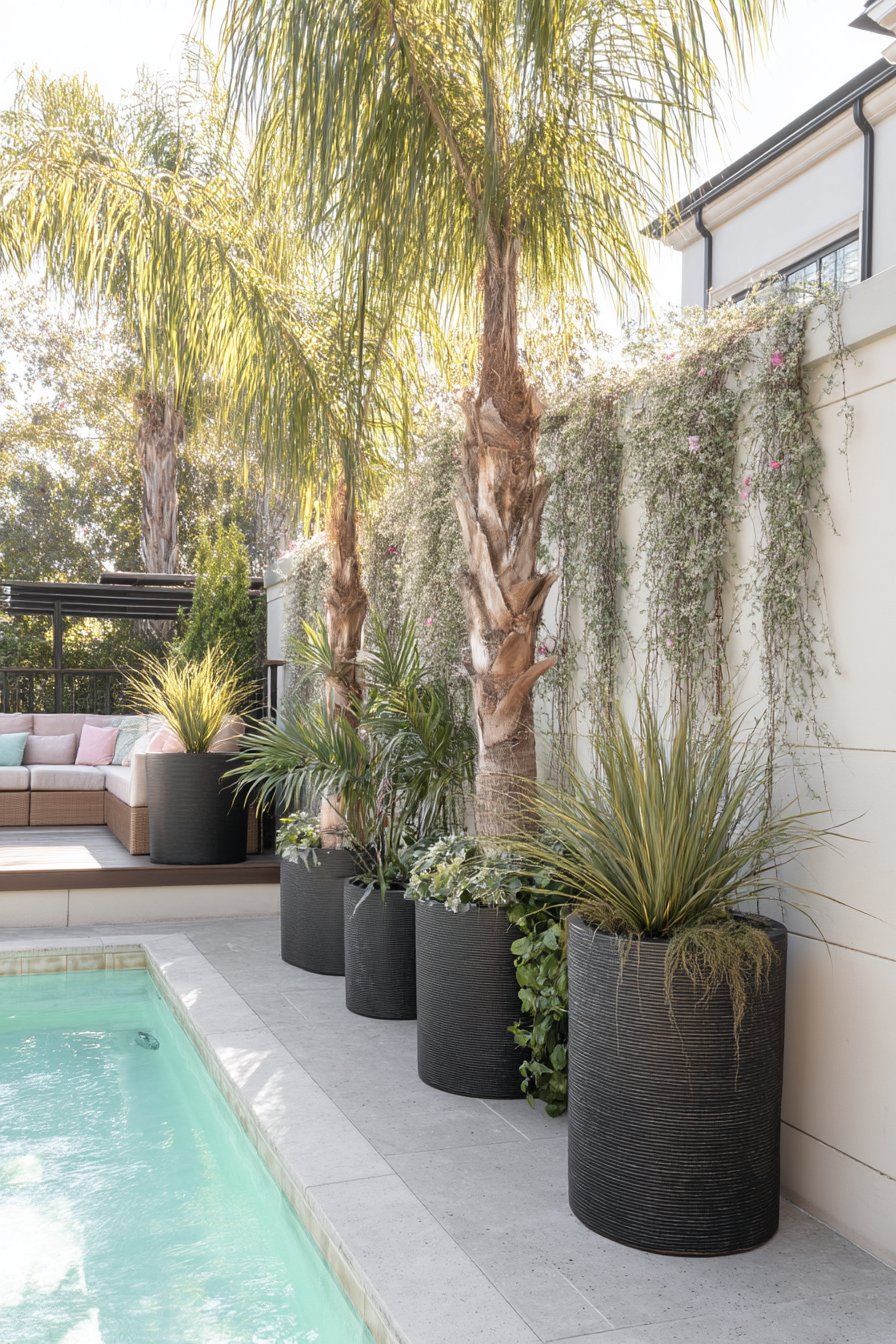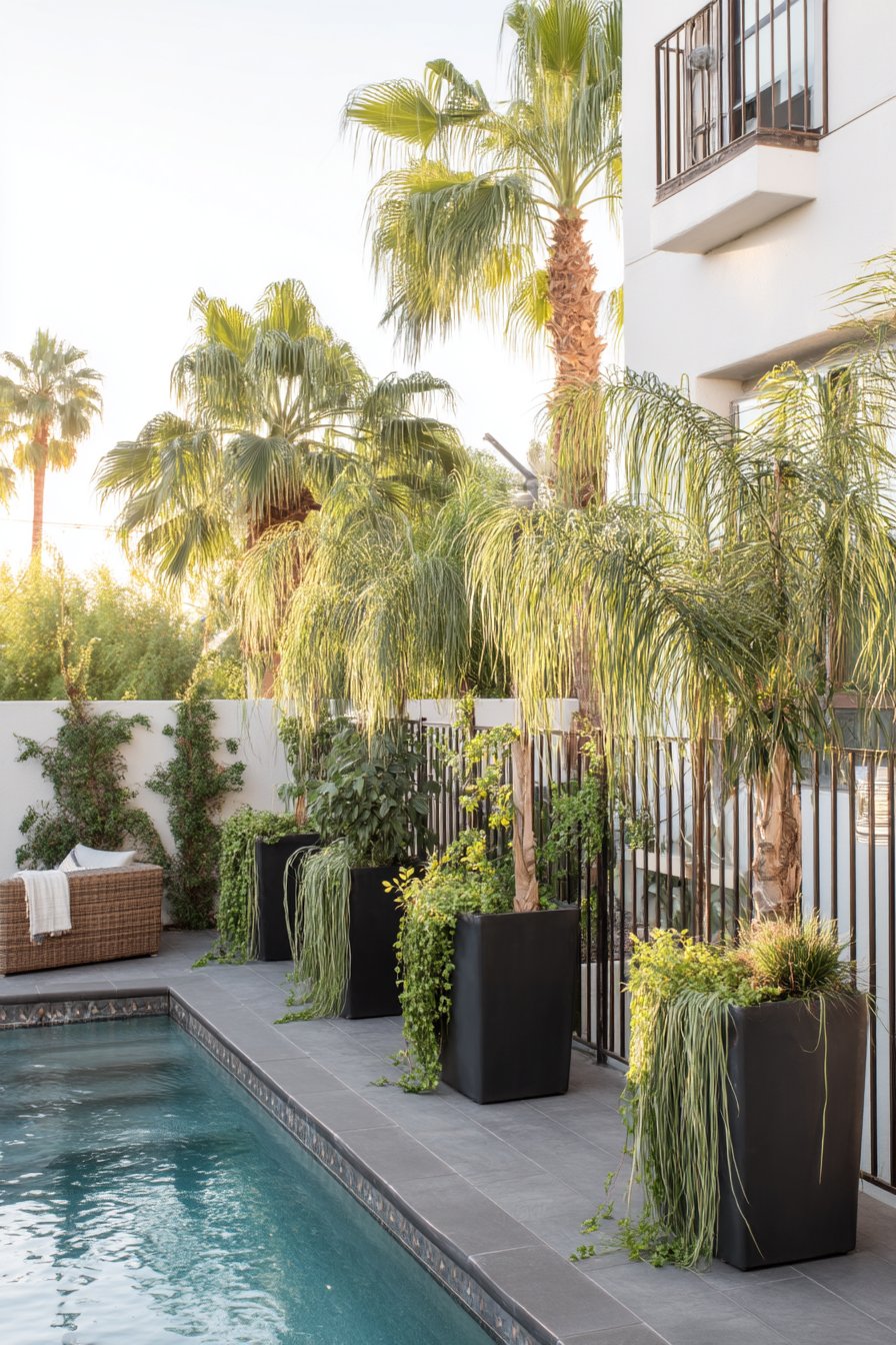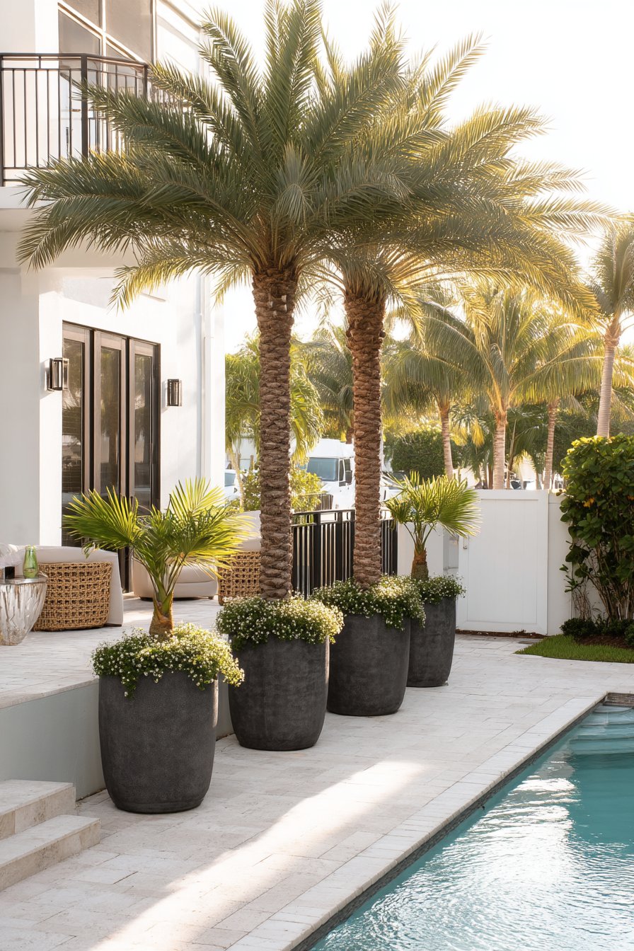 Lush palm trees and vibrant green planters create a tropical oasis, offering a serene space for relaxation by the pool. To achieve this look at home, select tall palms and cascading greenery, and use sleek black planters for a modern touch.