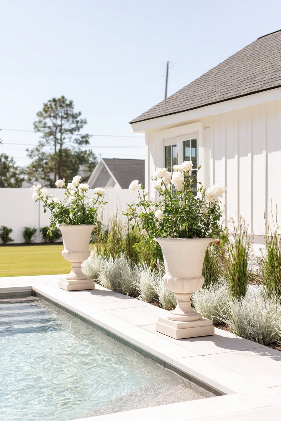 Elegant white rose planters flanking a serene pool create a timeless and sophisticated atmosphere, enhancing the outdoor space with their classic charm. To replicate this look, choose sturdy, decorative pots and pair them with lush greenery for contrast and texture.