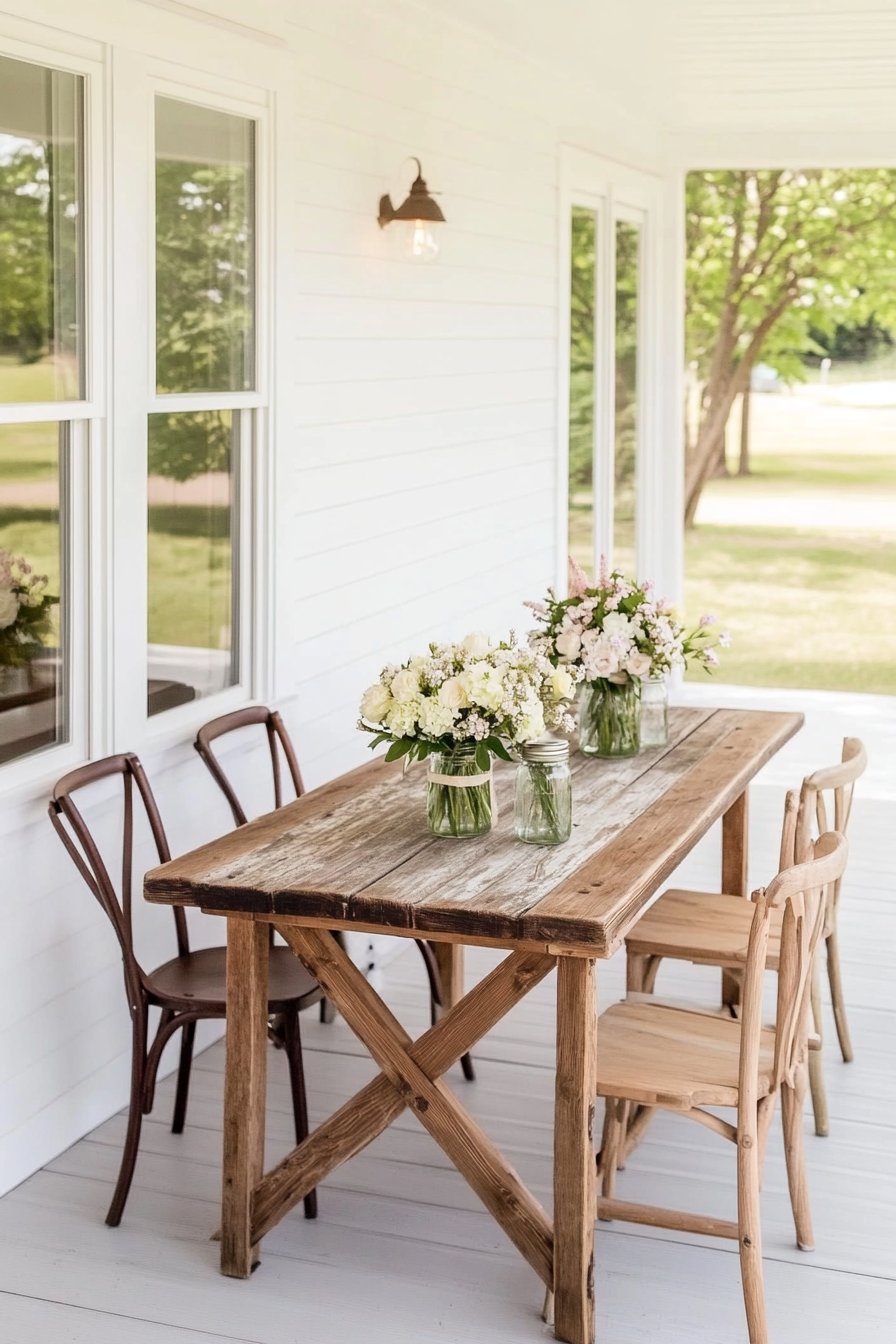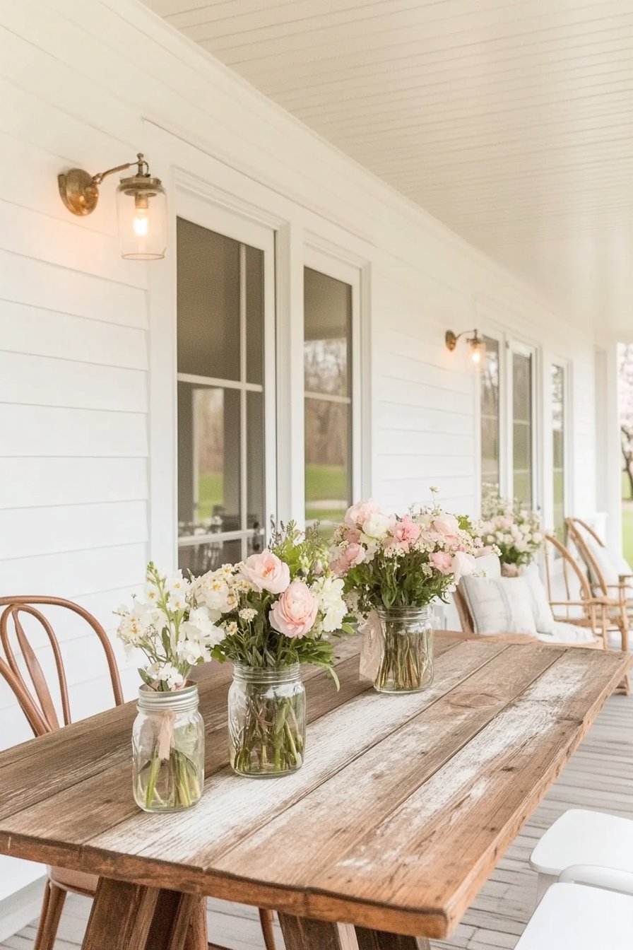The charming rustic porch arrangement features soft pastel blooms like peonies and hydrangeas in simple glass jars, enhancing the natural aesthetic. To replicate this look, mix seasonal flowers and use recycled containers for an eco-friendly touch.