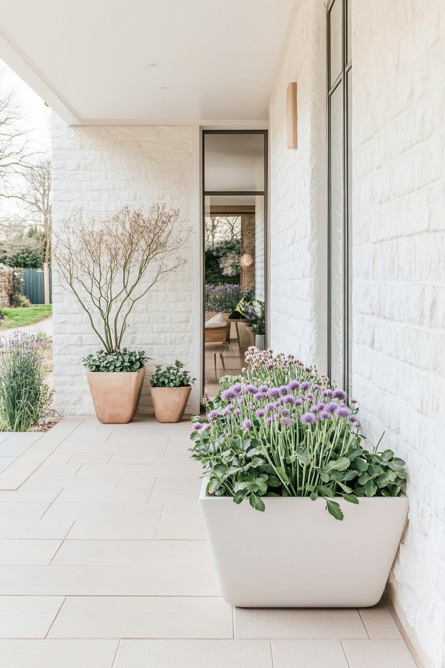 This contemporary design features elegant terracotta and sleek white planters filled with lush chives and vibrant greenery, creating a harmonious blend of textures. For a similar look, use varied planter sizes and choose plants that thrive in your climate, ensuring year-round appeal.
