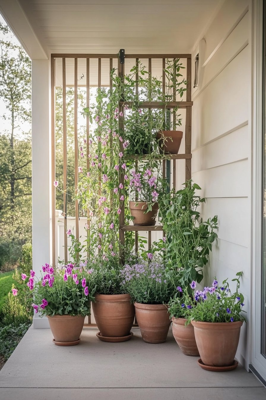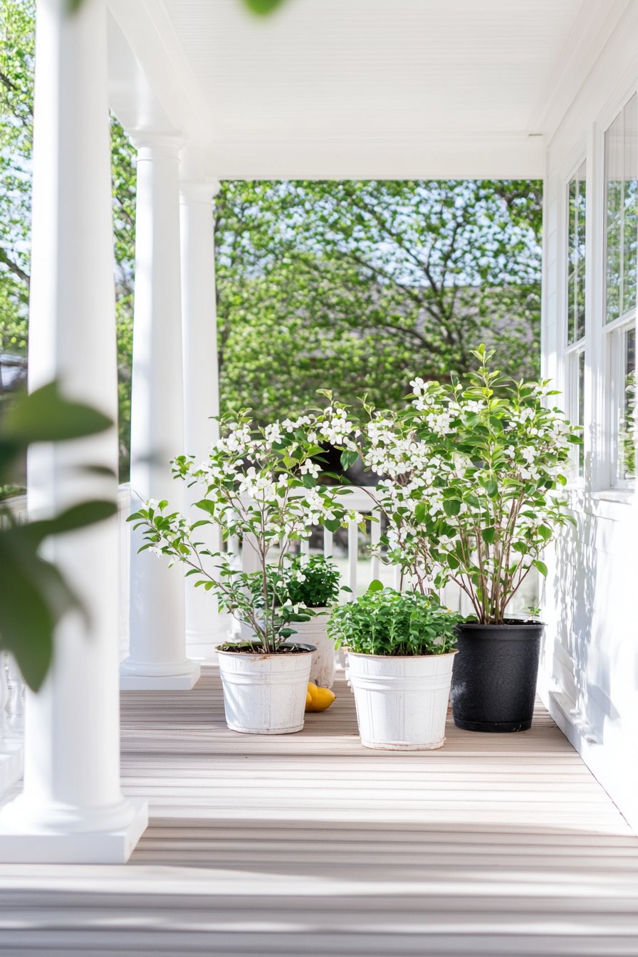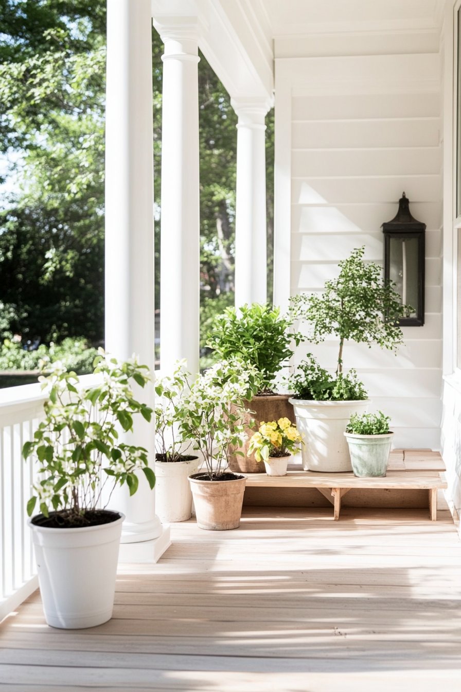 13) Charming Potted Plant Porch Design