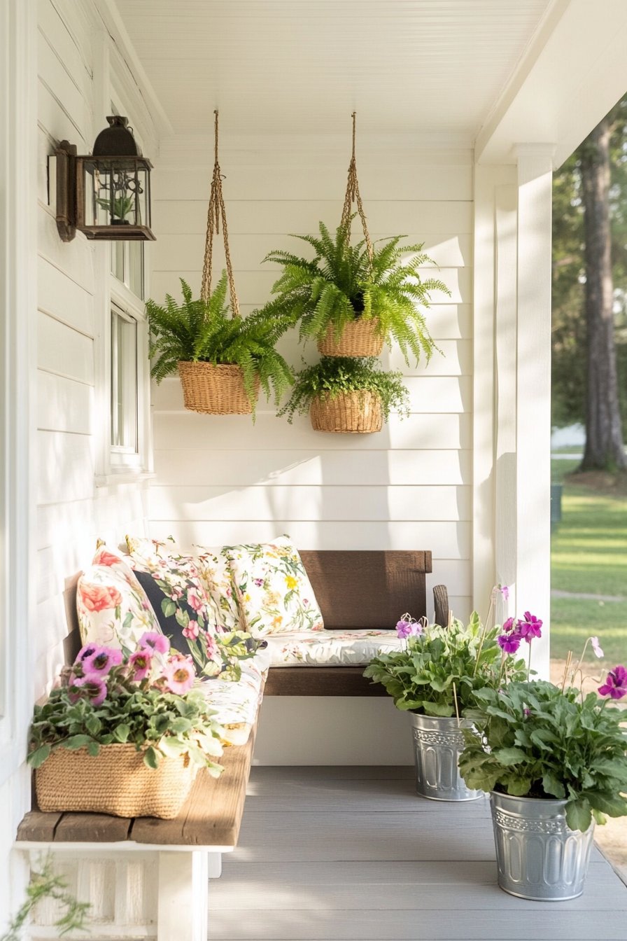 This inviting porch features lush ferns in woven baskets and vibrant petunias in stylish metal containers, creating a warm, welcoming atmosphere. To replicate this look, combine colorful floral cushions with greenery for a cozy, spring-inspired retreat.